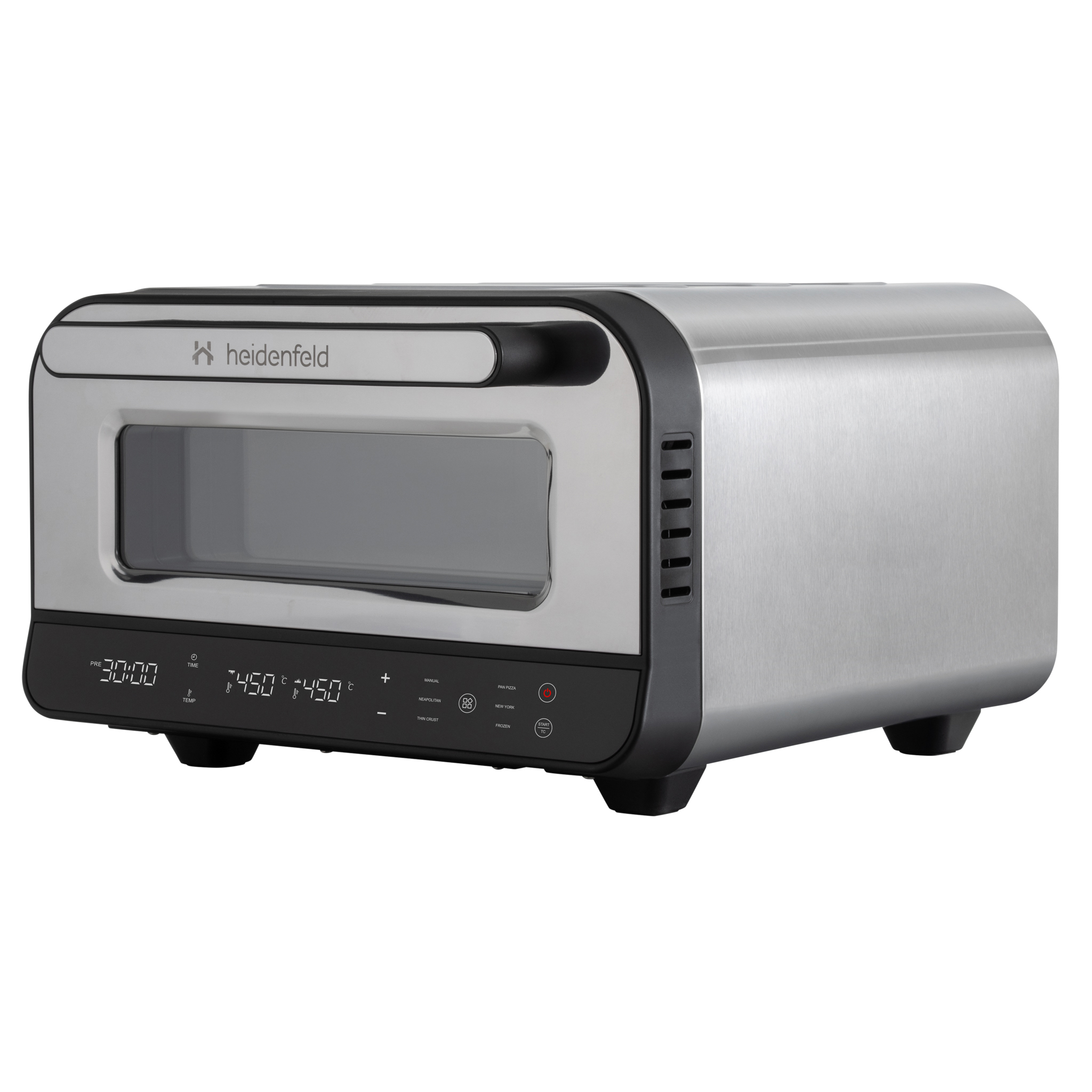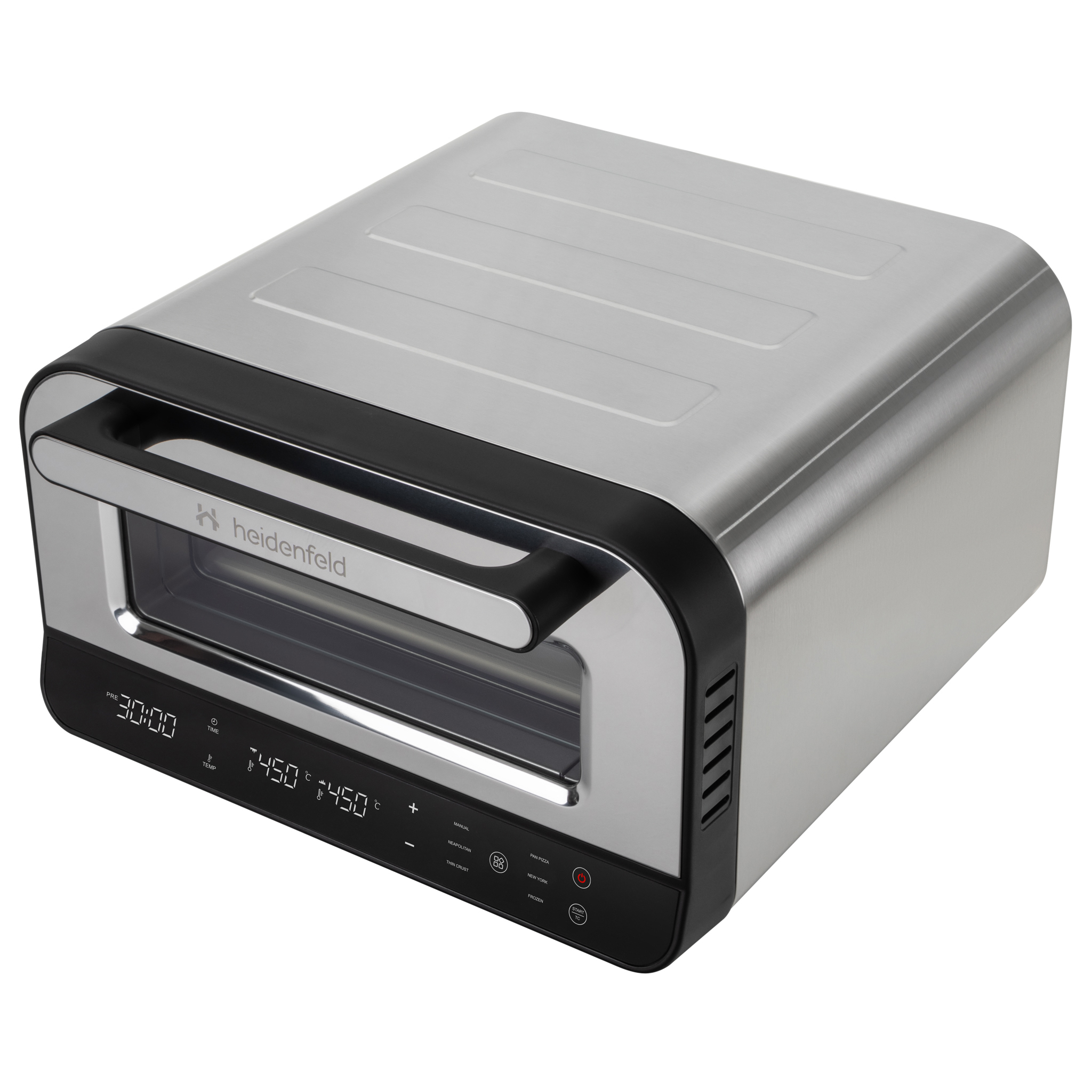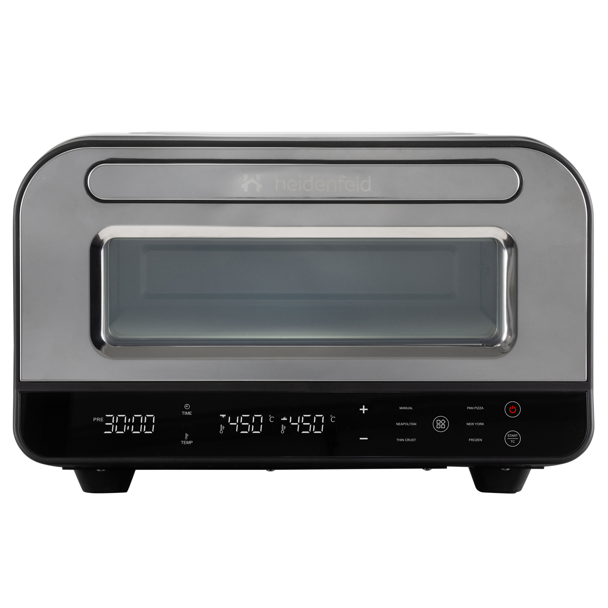 Sein Edelstahlgehäuse und die markante Front mit Sichtfenster machen ihn zum Highlight jeder Küche. Einfach anschließen, aufheizen und genießen – Ready to Use, wie man es von Heidenfeld kennt.