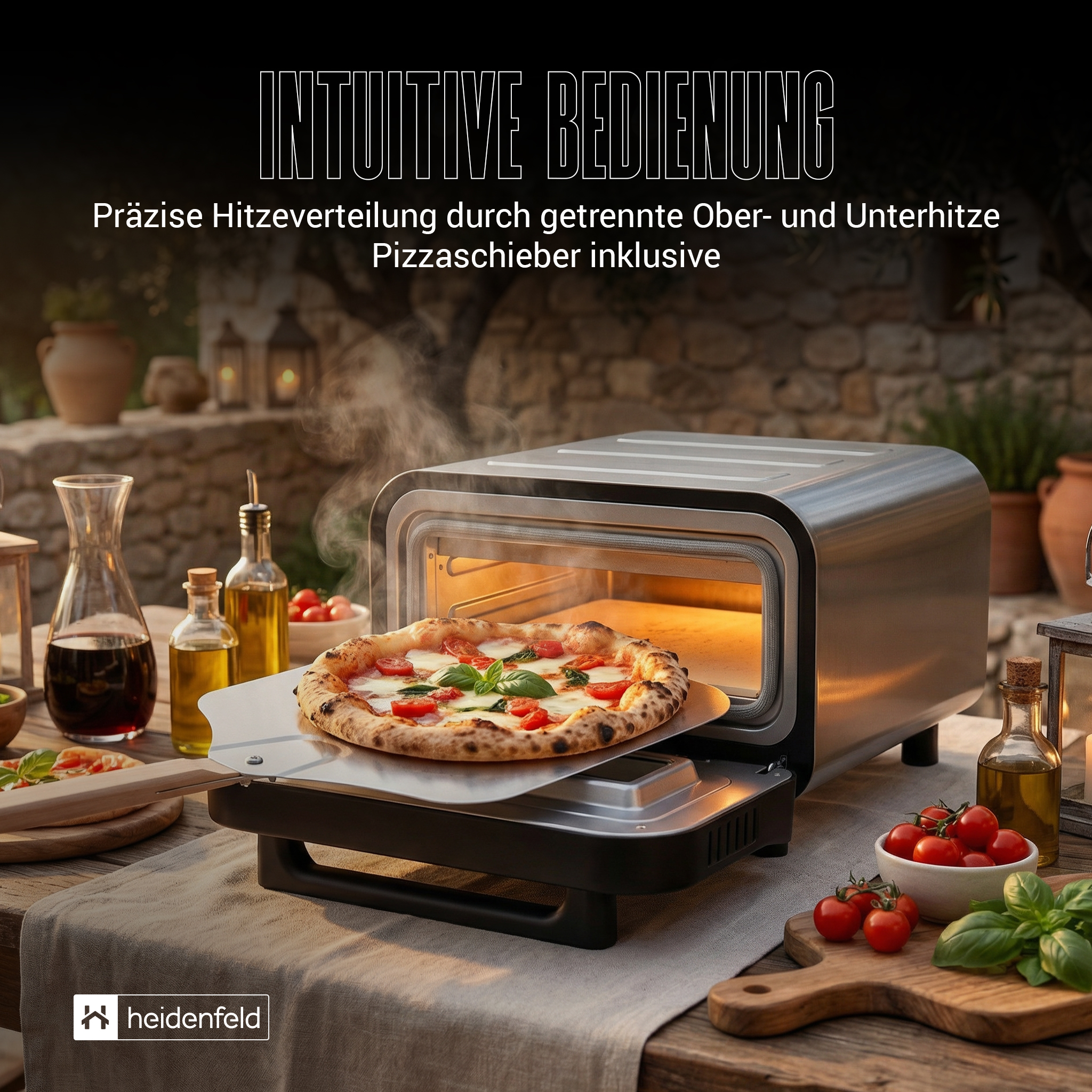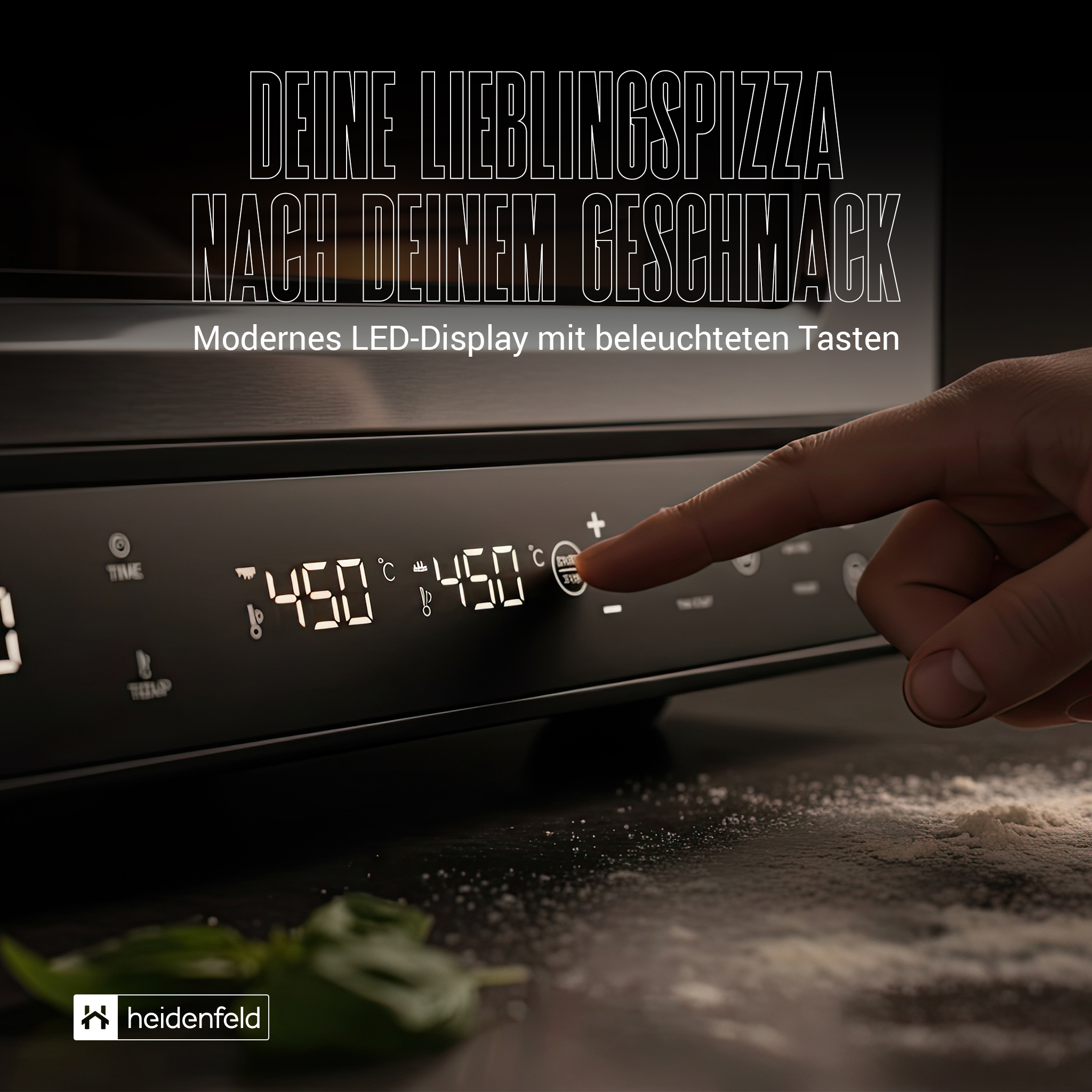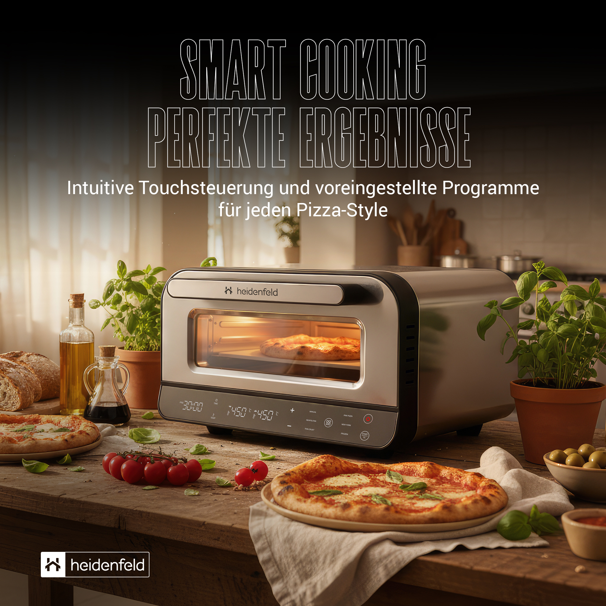 Der Heidenfeld Pizzaofen Pizzaboss vereint Profi-Performance, modernes Design und einfache Bedienung in einem kompakten Gerät. Mit bis zu 450 °C Spitzentemperatur, 5 intelligenten Backprogrammen und getrennter Ober- und Unterhitze gelingt jede Pizza perfekt – ob klassisch neapolitanisch, New York Style oder knusprig-dünn. Das große Sichtfenster mit Innenbeleuchtung, die intuitive Touchsteuerung und das isolierte Gehäuse sorgen für Komfort und Sicherheit im Alltag. Unterstützt wird das Erlebnis durch das exklusive Heidenfeld Pizza-E-Book mit 21 Rezepten, das jedem Käufer kostenlos zur Verfügung steht. So wird aus einem Küchengerät ein Erlebnis – von der ersten Idee bis zum duftenden Stück Pizza.