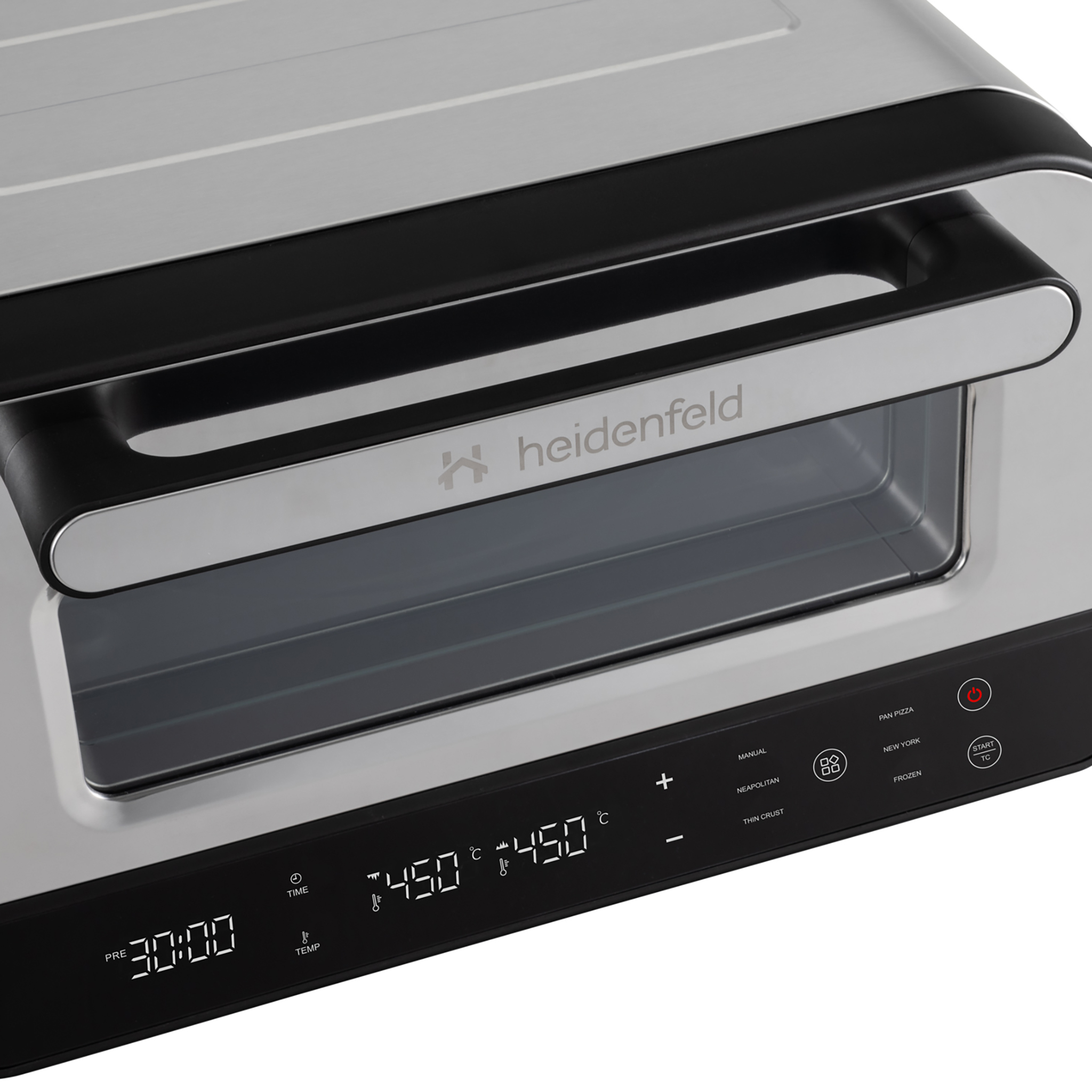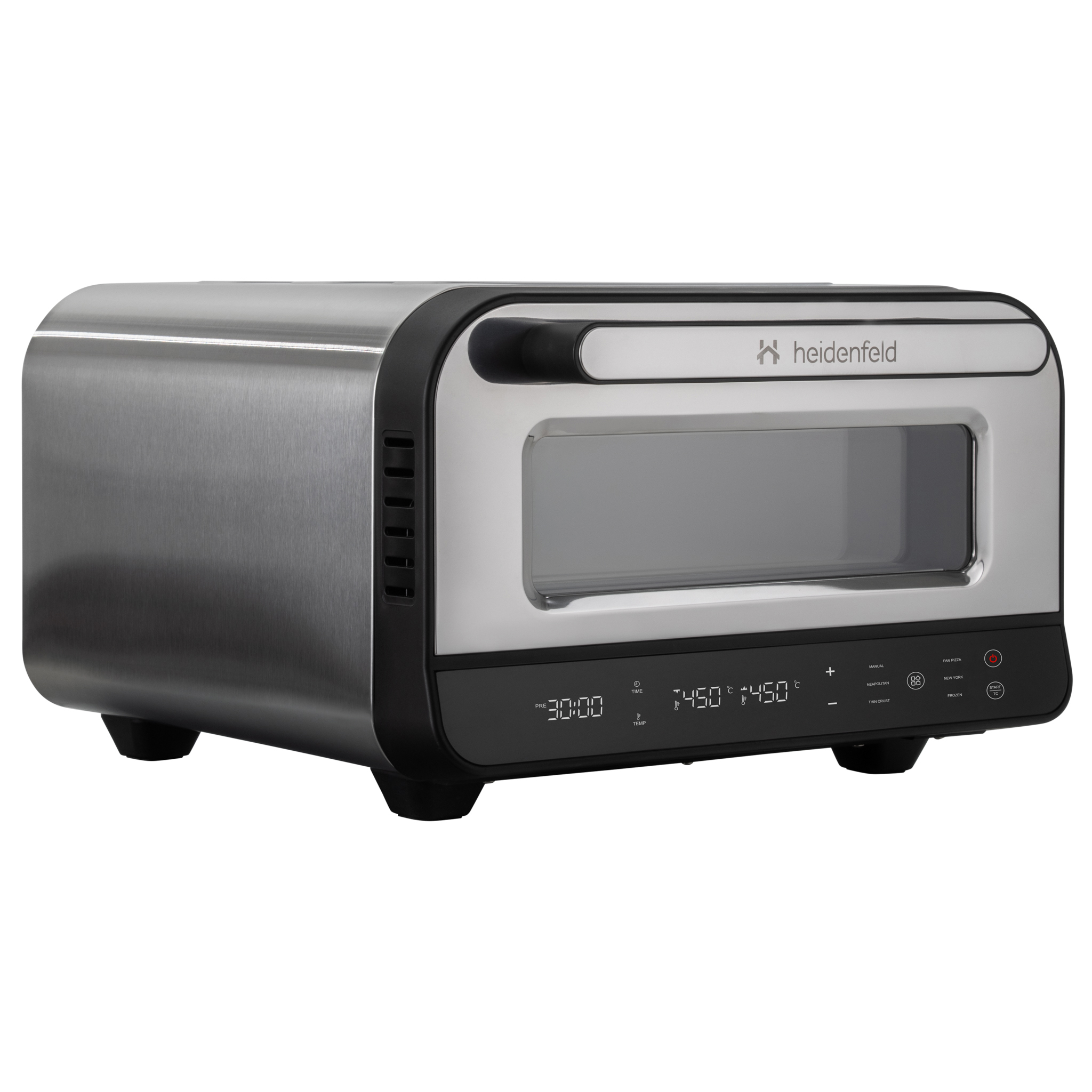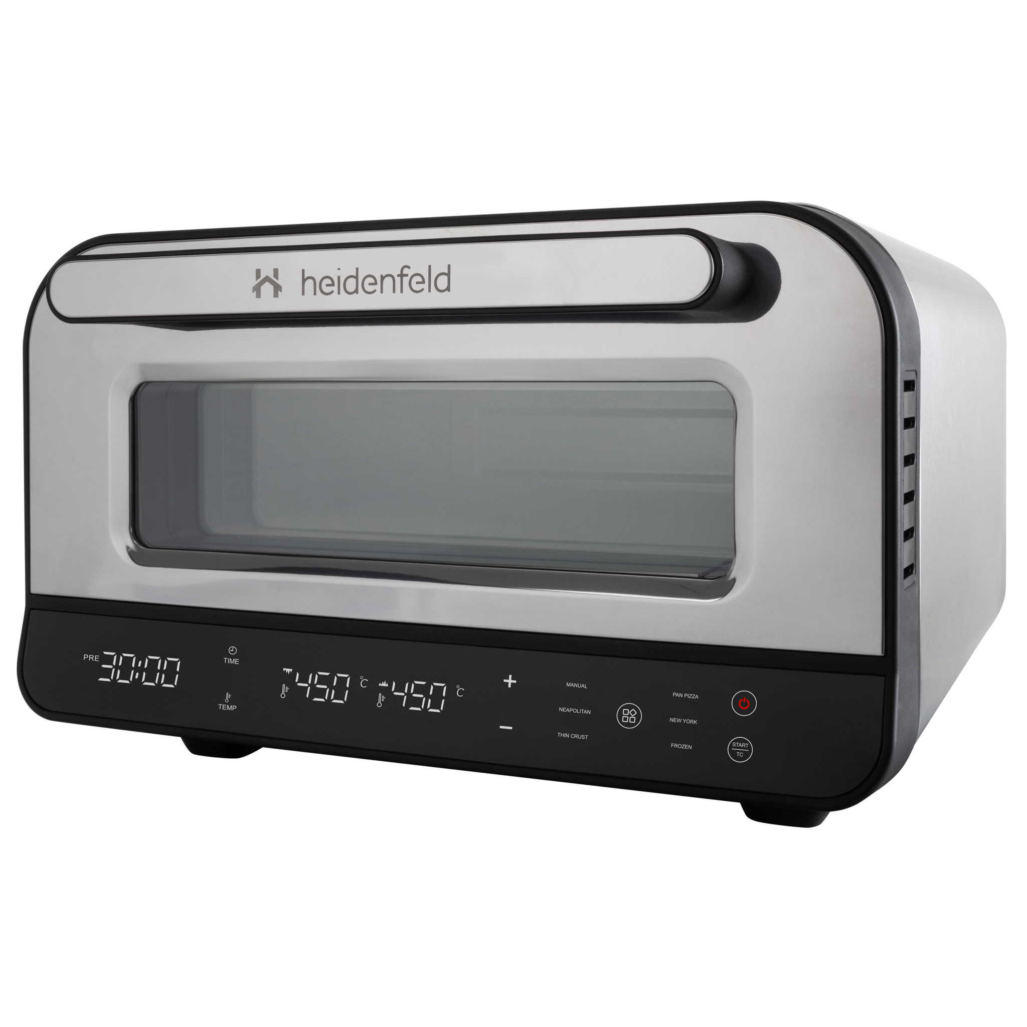 Der Heidenfeld Pizzaofen Pizzaboss vereint Profi-Performance, modernes Design und einfache Bedienung in einem kompakten Gerät. Mit bis zu 450 °C Spitzentemperatur, 5 intelligenten Backprogrammen und getrennter Ober- und Unterhitze gelingt jede Pizza perfekt – ob klassisch neapolitanisch, New York Style oder knusprig-dünn. Das große Sichtfenster mit Innenbeleuchtung, die intuitive Touchsteuerung und das isolierte Gehäuse sorgen für Komfort und Sicherheit im Alltag. Unterstützt wird das Erlebnis durch das exklusive Heidenfeld Pizza-E-Book mit 21 Rezepten, das jedem Käufer kostenlos zur Verfügung steht. So wird aus einem Küchengerät ein Erlebnis – von der ersten Idee bis zum duftenden Stück Pizza.