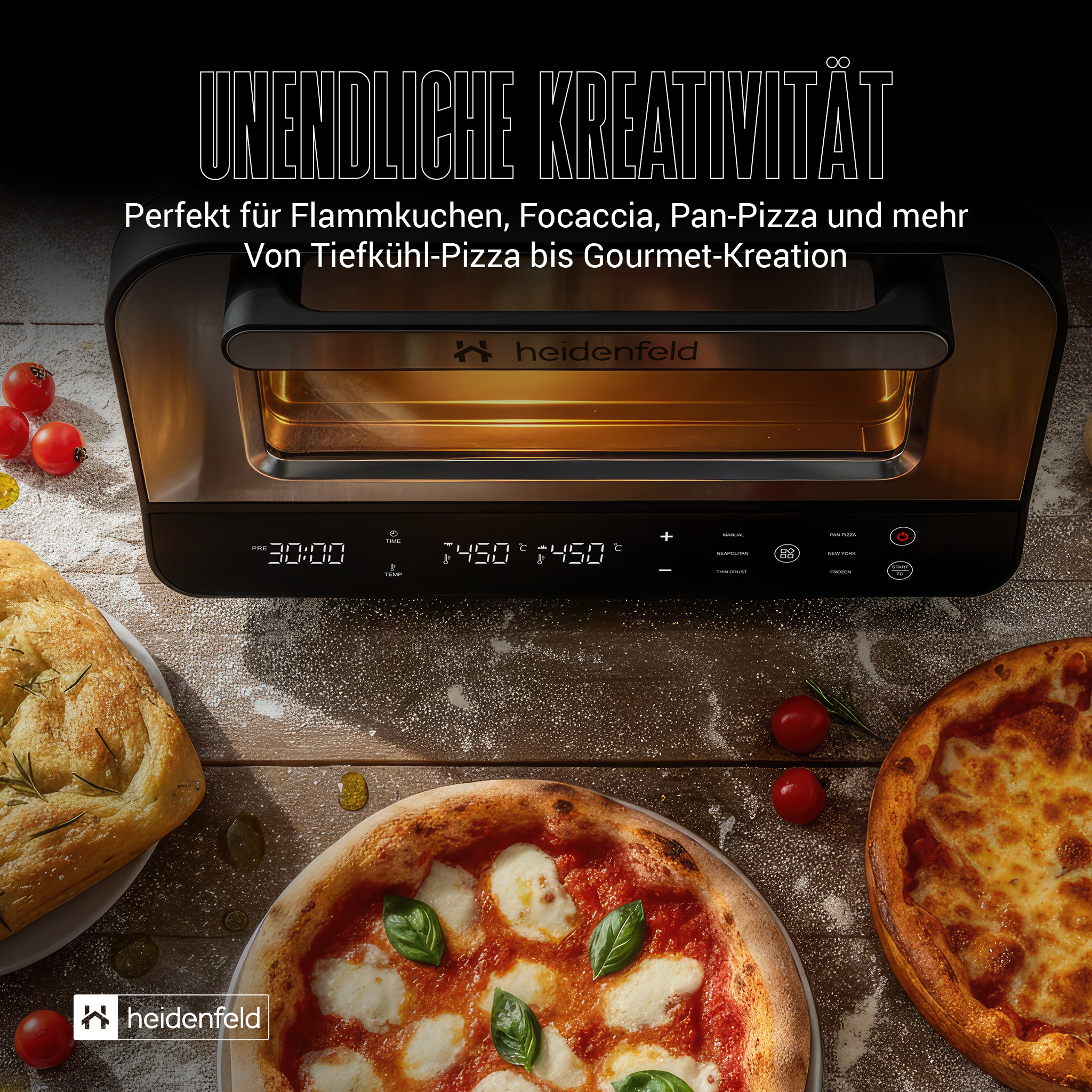Gleichmäßige Hitzeverteilung und schnelle Aufheizzeiten garantieren perfekte Ergebnisse. Von knusprig-dünn bis luftig-fluffig – entdecke mit Heidenfeld, was dein Teig wirklich kann.