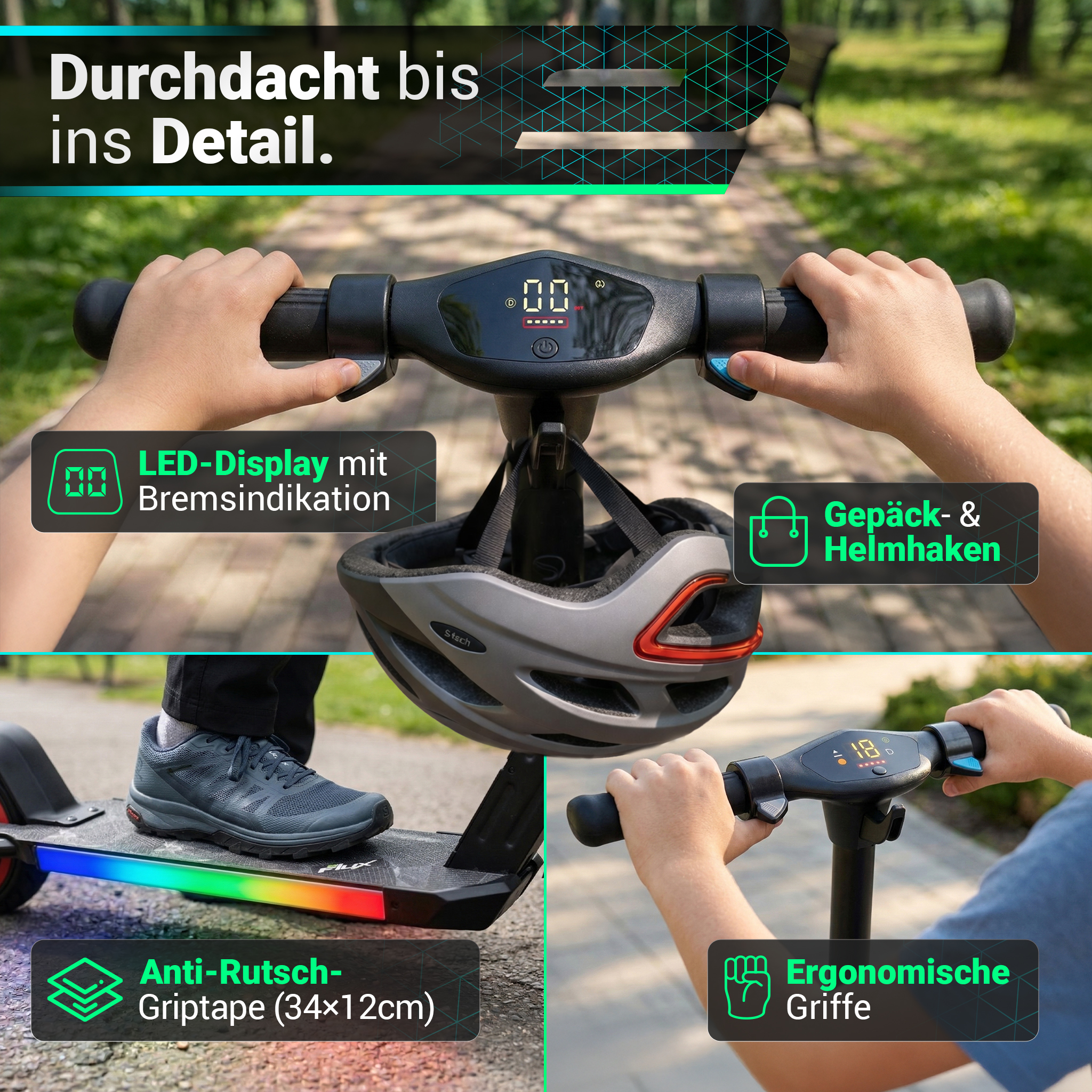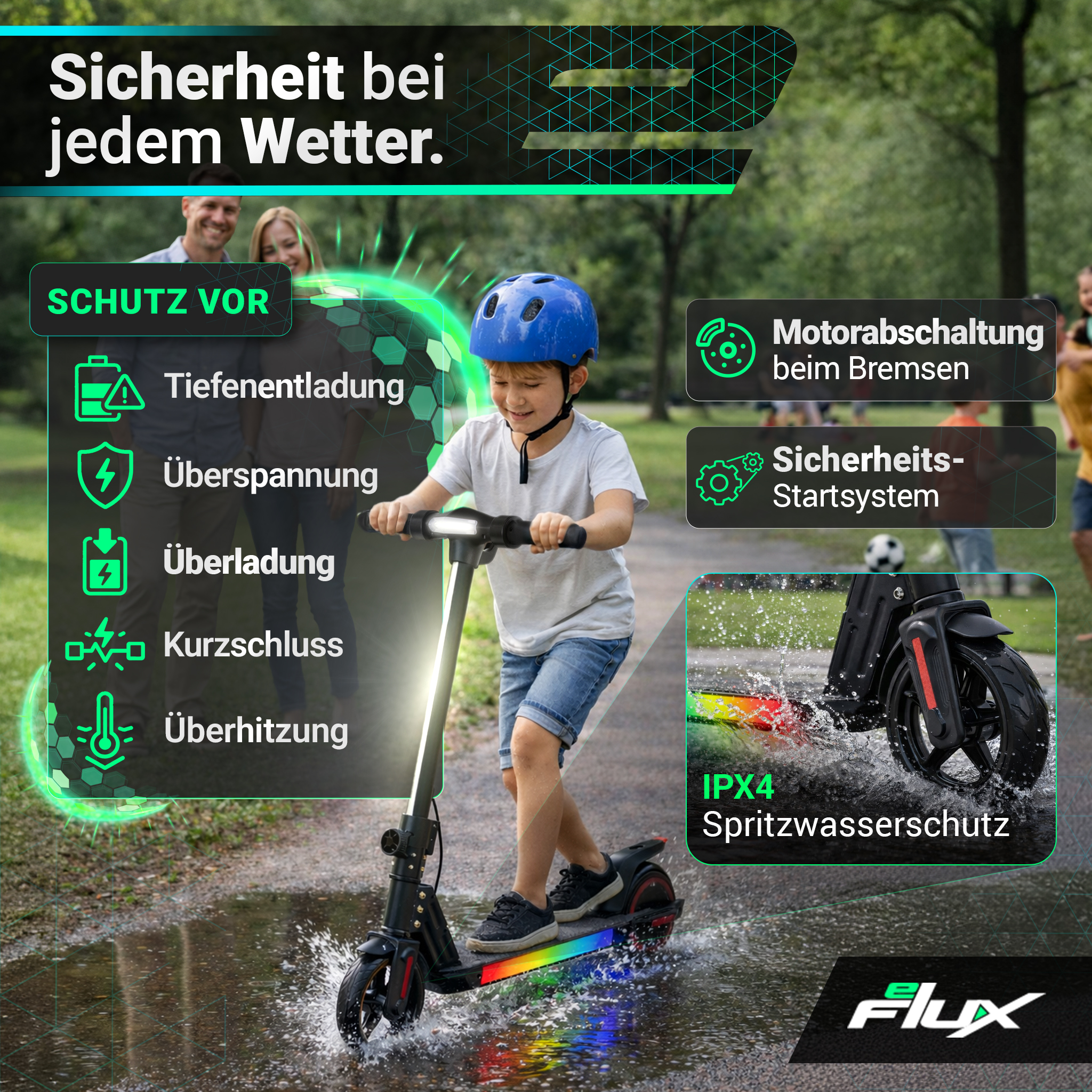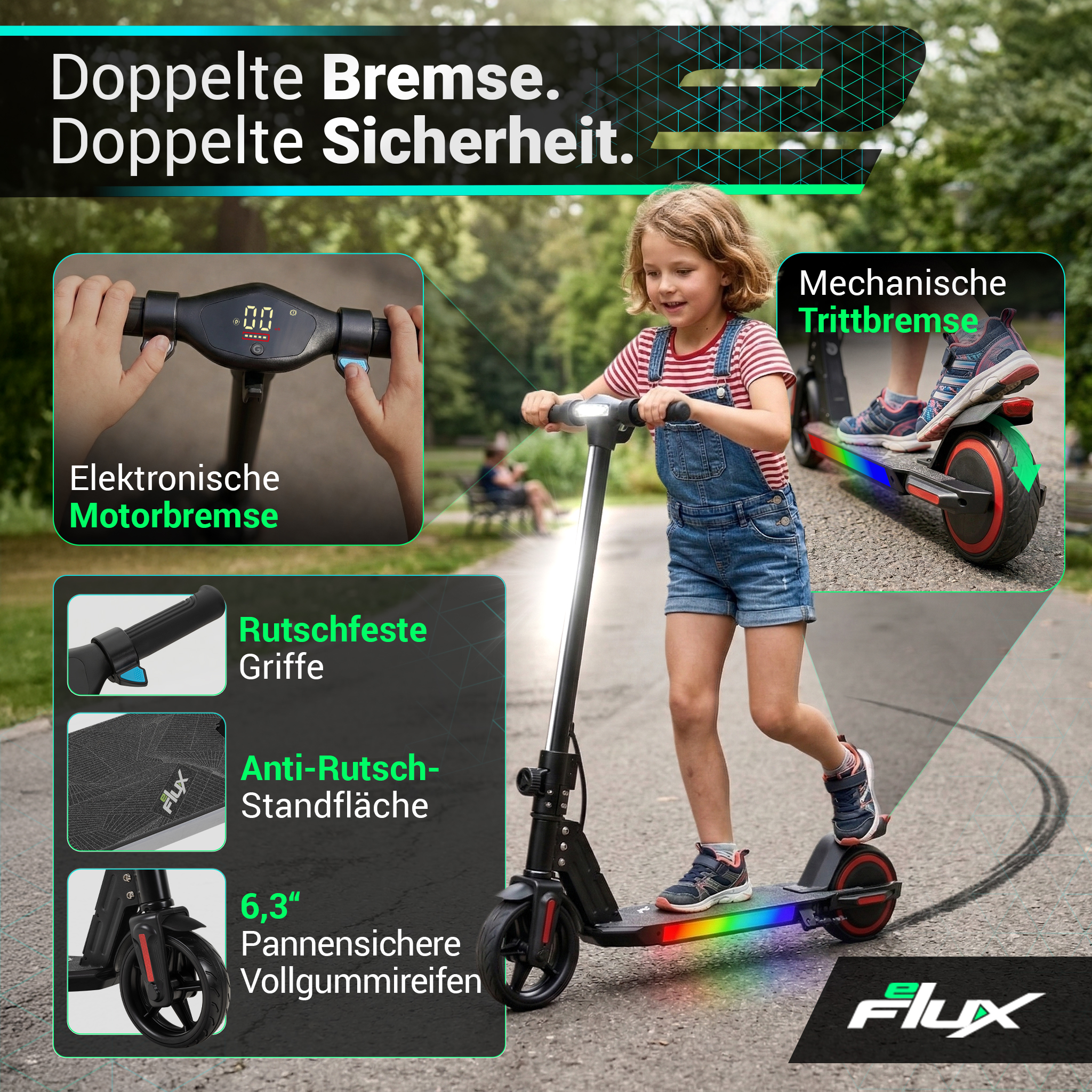 | Sicherheit | Duales Bremssystem, Sicherheits-Start, Motorabschaltung beim Bremsen, auffällige Beleuchtung und Reflektoren für gute Sichtbarkeit, pannensichere Vollgummireifen, rutschfeste Standfläche & Griffe |