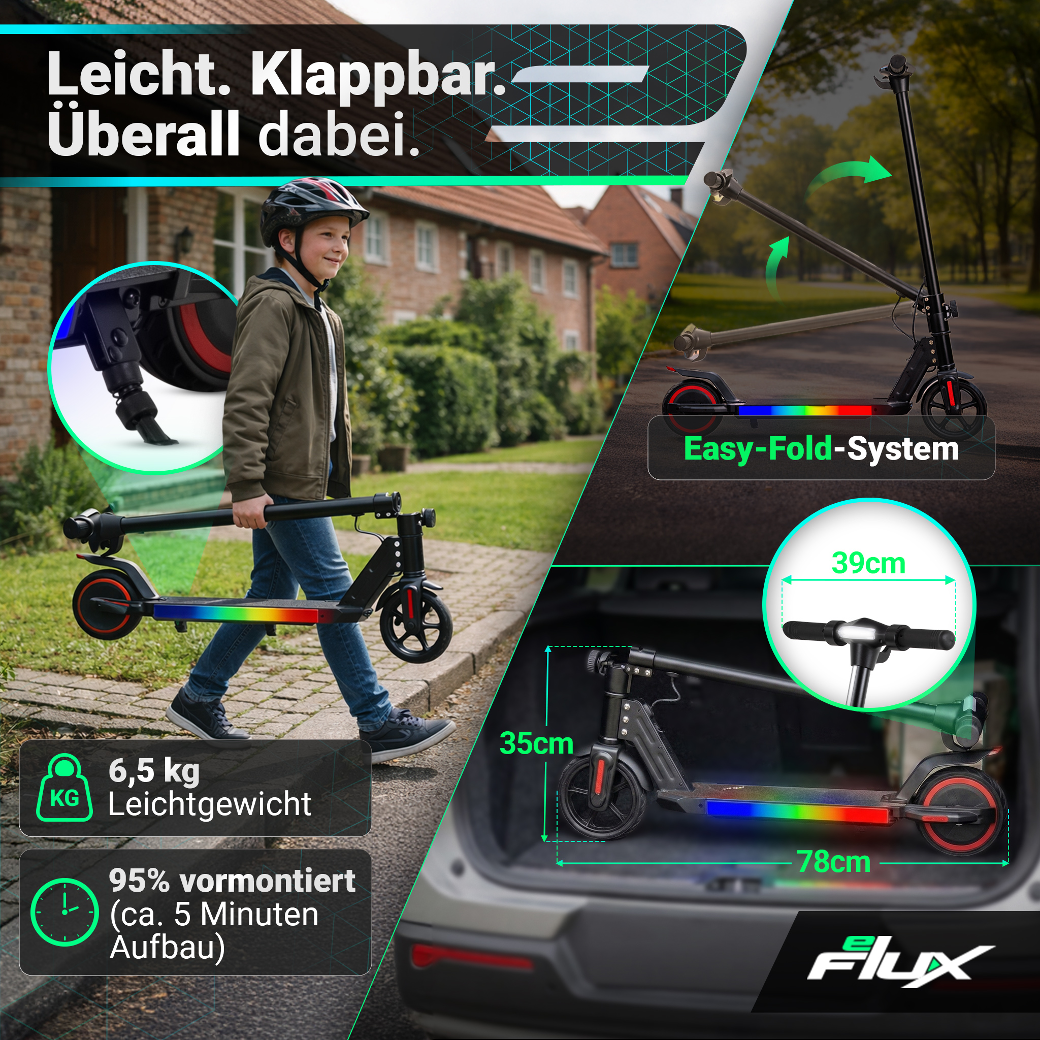 | Produkthighlights | Hohe Sicherheit durch duales Bremssystem, Sicherheits-Start & Motorabschaltung, altersgerecht ausgelegte Leistung mit 150-W-Motor & max. 16 km/h, leichter & klappbarer Rahmen für einfachen Transport, wartungsarmer Direktantrieb, auffällige Beleuchtung |