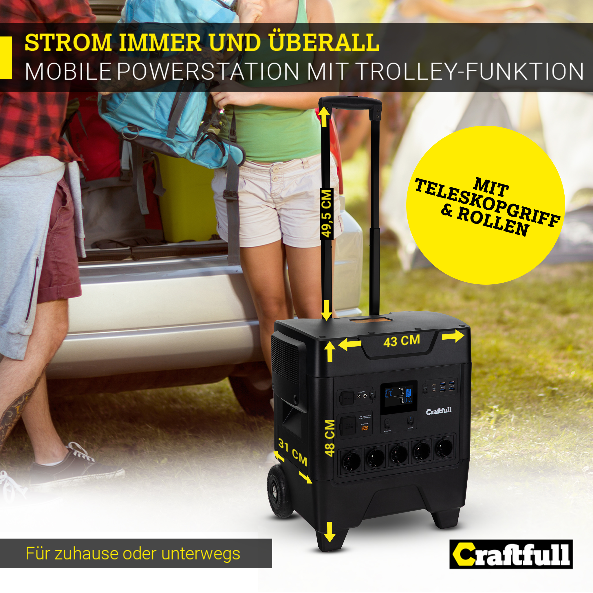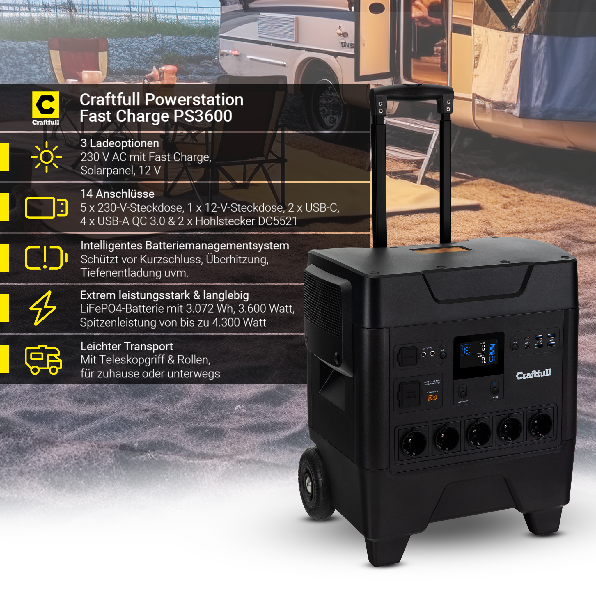 Nie wieder beim Camping und zuhause auf die Vorzüge von Handy & Co. verzichten – zu schön, um wahr zu sein? Im Gegenteil: Mit der Craftfull Powerstation Fast Charge PS3600 haben Sie immer genügend Energie für all Ihre Geräte zur Verfügung. In nur vier Stunden ist der Stromspeicher vollständig aufgeladen. Dank der 14 Anschlüsse haben Sie stets den Richtigen für Tablet, Wasserkocher und vieles mehr parat. Durch den starken Lithium-Eisenphosphat-Akkumulator profitieren Sie selbst nach über 2.000 Ladezyklen von 80 % der Kapazität. Mit dem ausgefahrenen Teleskopgriff lässt sich die Powerstation wie ein kleiner Trolley von A nach B schieben. Genießen Sie jetzt die Bequemlichkeit Ihrer elektrischen Endgeräte – überall und zu jeder Zeit!