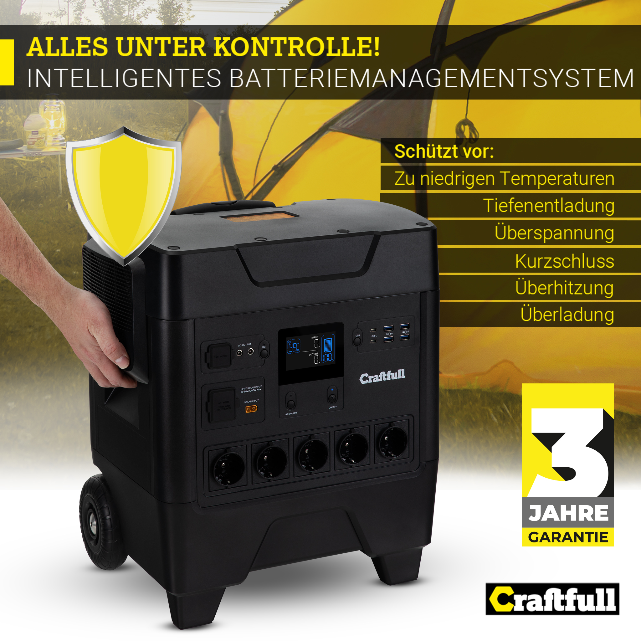 Damit Ihnen die Craftfull Powerstation Fast Charge PS3600 lange erhalten bleibt, punktet sie mit bester Qualität. Dies bezeugt auch die Garantie von drei Jahren. Darüber hinaus ist im Inneren ein intelligentes Batteriemanagementsystem verbaut.