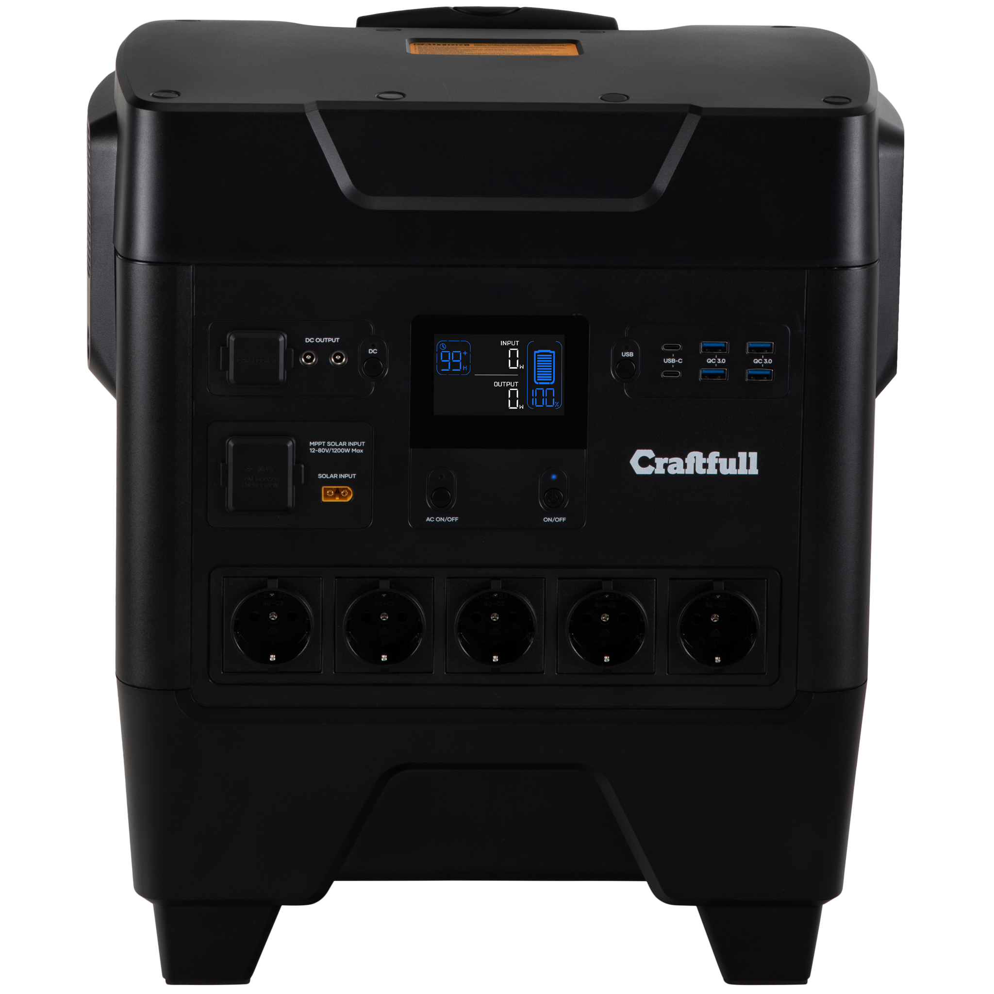 | Anschlüsse: | Ausgänge: 2x USB-C, 4x USB-A QC 3.0, 1x KFZ-Ladestecker (Zigarettenanzünder), 5x Schuko Steckdose, 2x Hohlstecker DC5521, Eingänge: 1x Solar XT60, 1x Kaltgerätestecker |