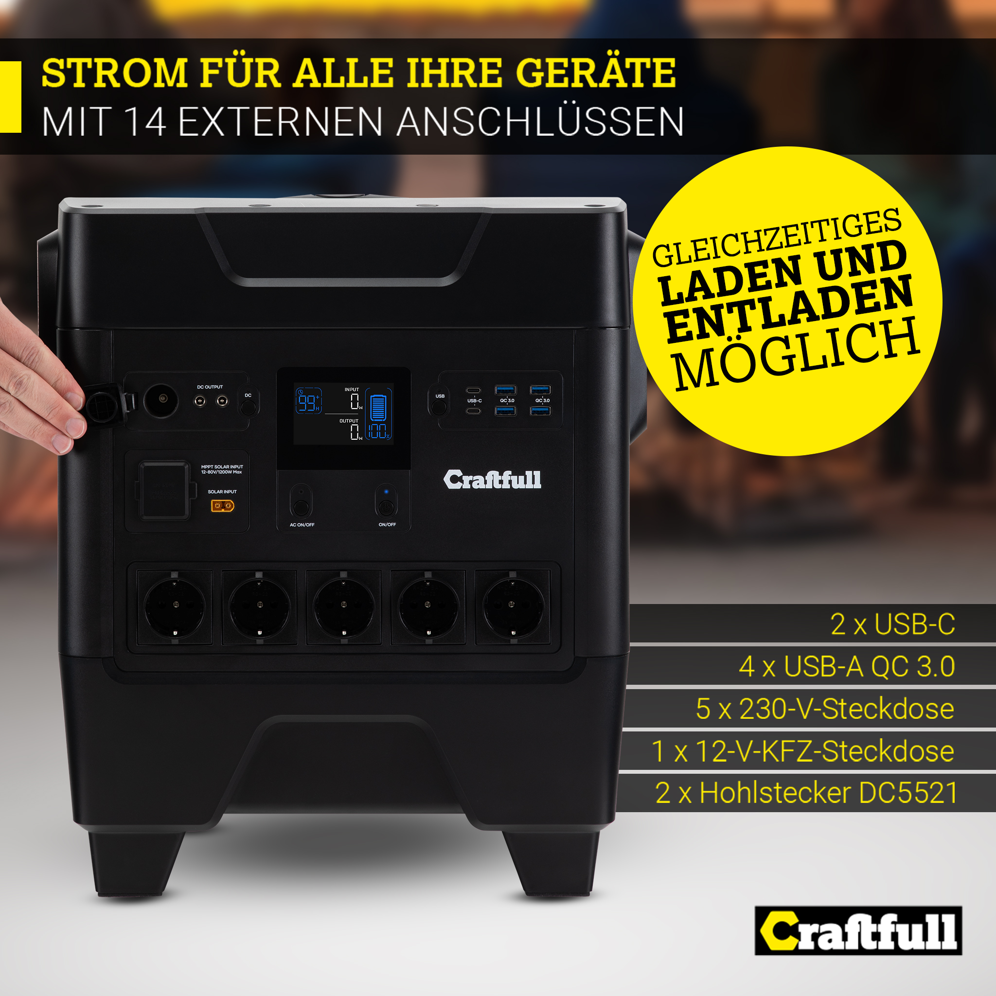 Aber auch daheim ist sie ein praktischer Helfer. Sie haben keine passende Steckdose im Garten? Die Craftfull Powerstation Fast Charge PS3600 liefert Bohrmaschine & Co. die benötigte Power. Auch im Falle eines Blackouts sind Sie bestens versorgt.