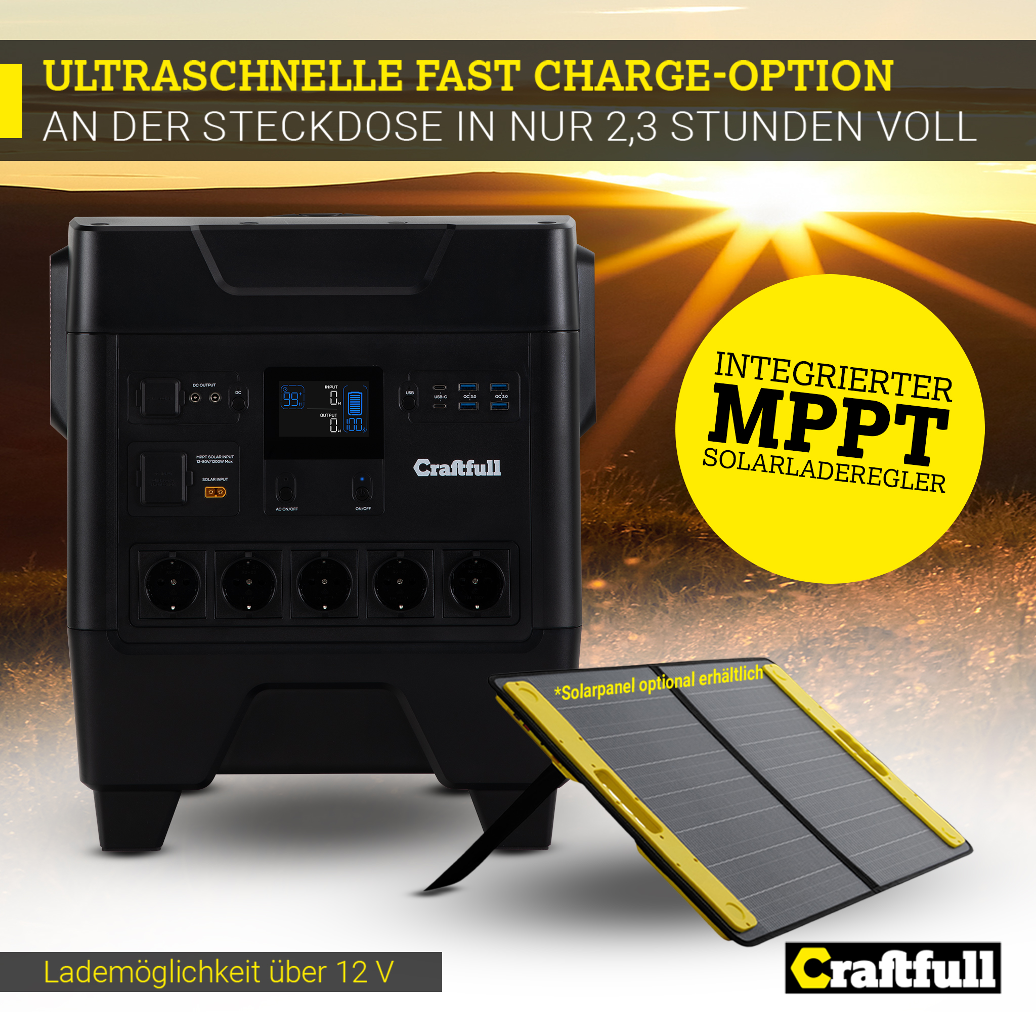 Nachhaltige Alternativen liegen Ihnen am Herzen? Dann liegen Sie mit der Craftfull Powerstation Fast Charge PS3600 genau richtig. Denn sie lässt sich über ein passendes Solarpanel aufladen. Dank des MPPT-Reglers greifen Sie dabei stets auf die bestmöglichen Erträge zu – auch bei schlechterem Wetter.