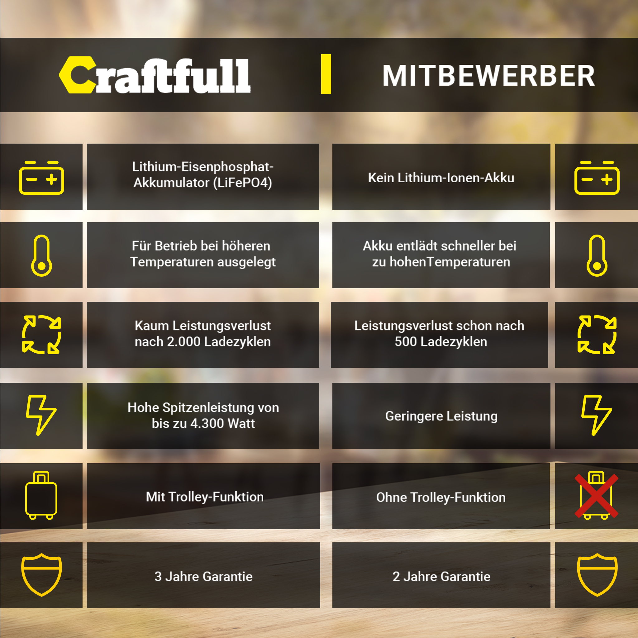 Eine hervorragende Leistung benötigt hervorragende Komponenten. Genau deshalb befindet sich im Inneren der Craftfull Powerstation Fast Charge PS3600 ein hochwertiger Lithium-Eisenphosphat-Akkumulator mit 3.248 Wh.