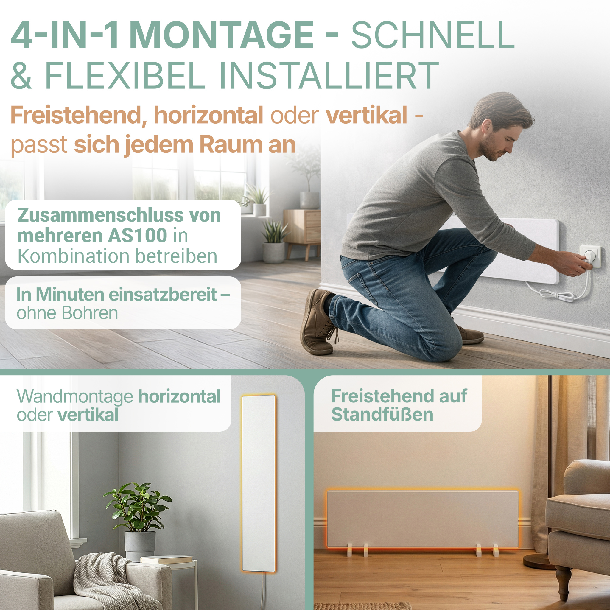 | Lieferumfang | Anti-Schimmel Heizung AS100, Standfüße, Verbindungskabel (2er-Set), Montagematerial, Bedienungsanleitung |