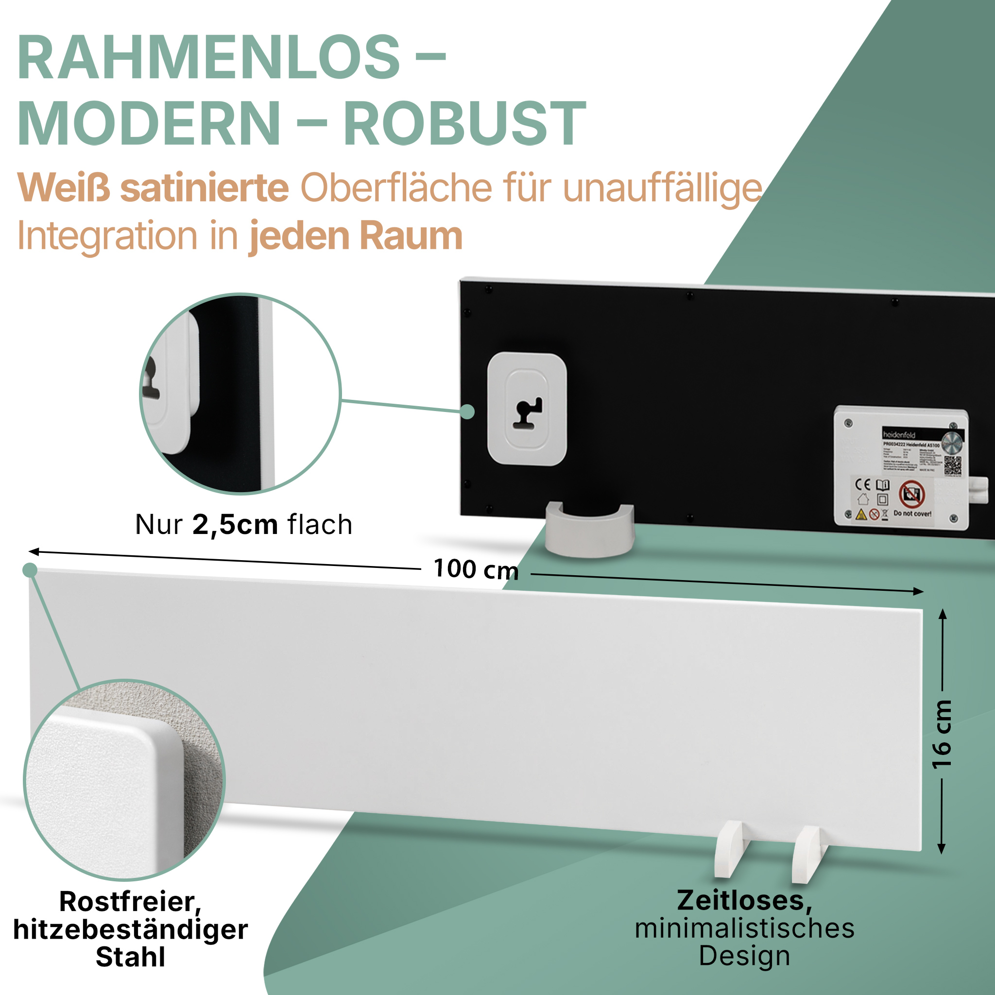 | Produkthighlights: | 10 Jahre Garantie, effektiver Schimmelschutz ohne Chemie, energiesparend, geräuschlos, allergikerfreundlich & berührungssicher, ideal für Haushalte mit Kindern und Tieren, modular erweiterbar bis 10 Heizungen, flexibel montierbar |