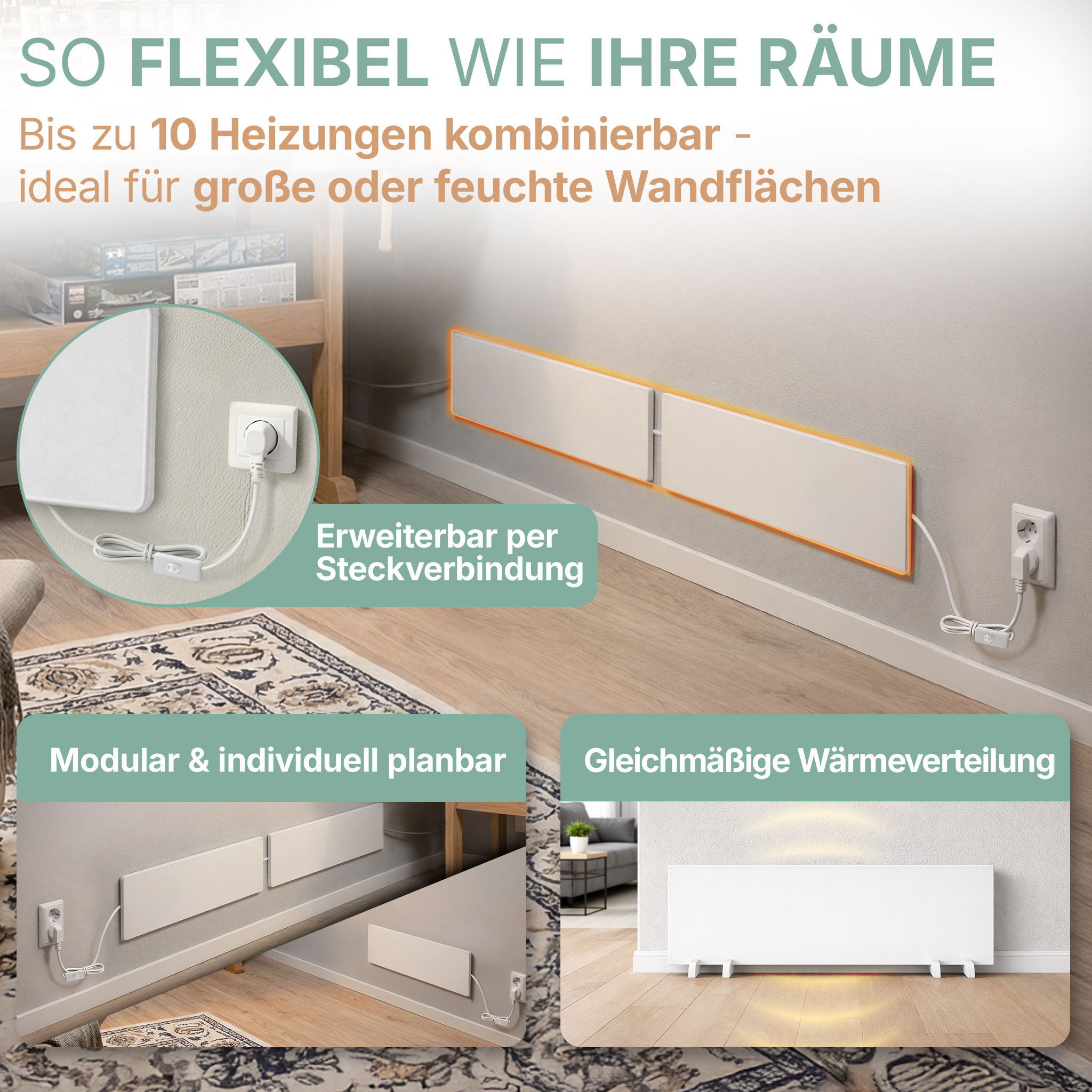 | Produkthighlights | 10 Jahre Garantie, effektiver Schimmelschutz ohne Chemie, energiesparend, geräuschlos, allergikerfreundlich & berührungssicher, ideal für Haushalte mit Kindern und Tieren, modular erweiterbar bis 10 Heizungen, flexibel montierbar |