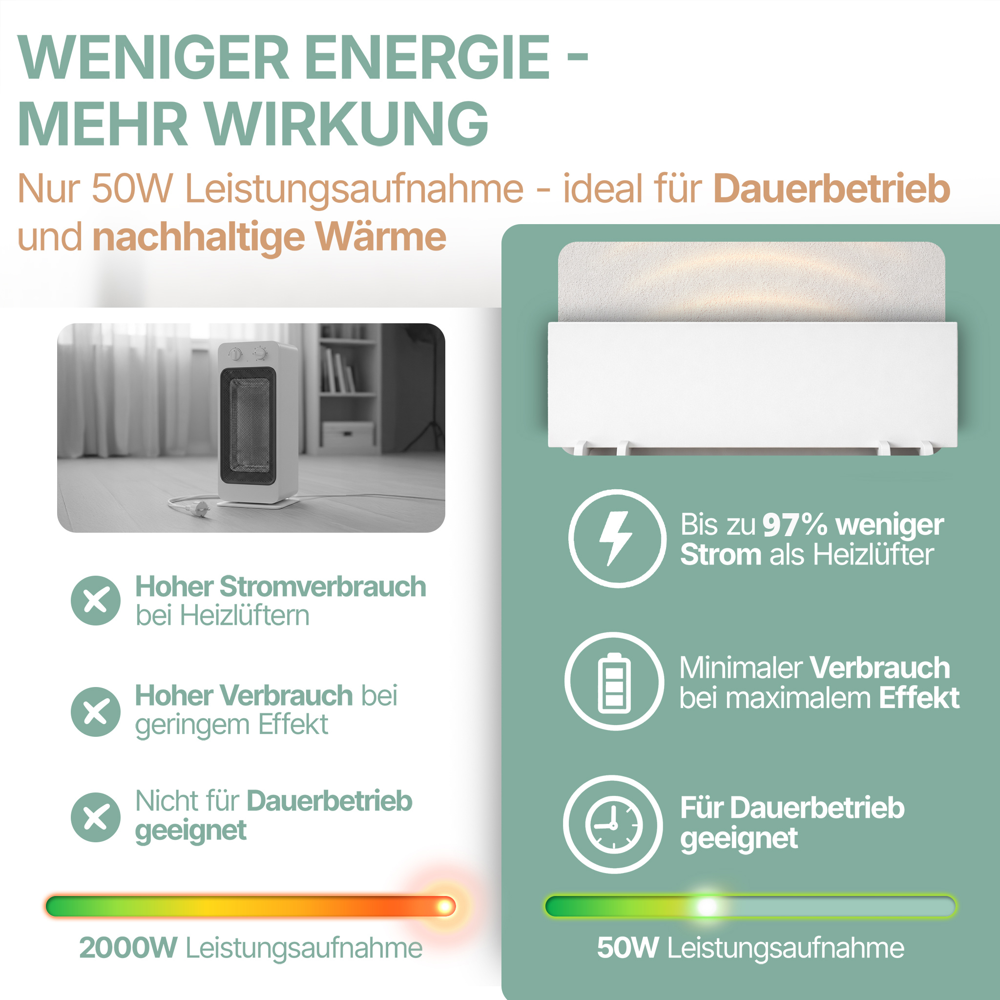| Heizleistung | Einzeln: 50 W, 2er-Set: 100 W |