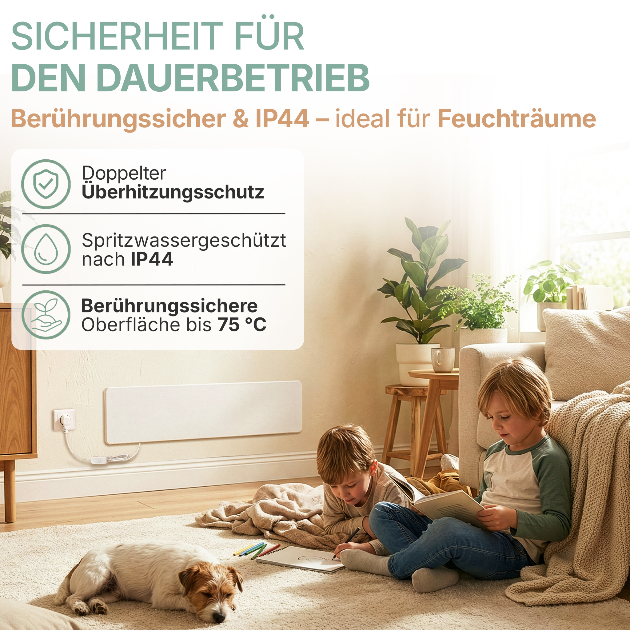 | Sicherheit | Doppelter Überhitzungsschutz, berührungssichere Oberfläche, keine Verbrennungsgefahr |