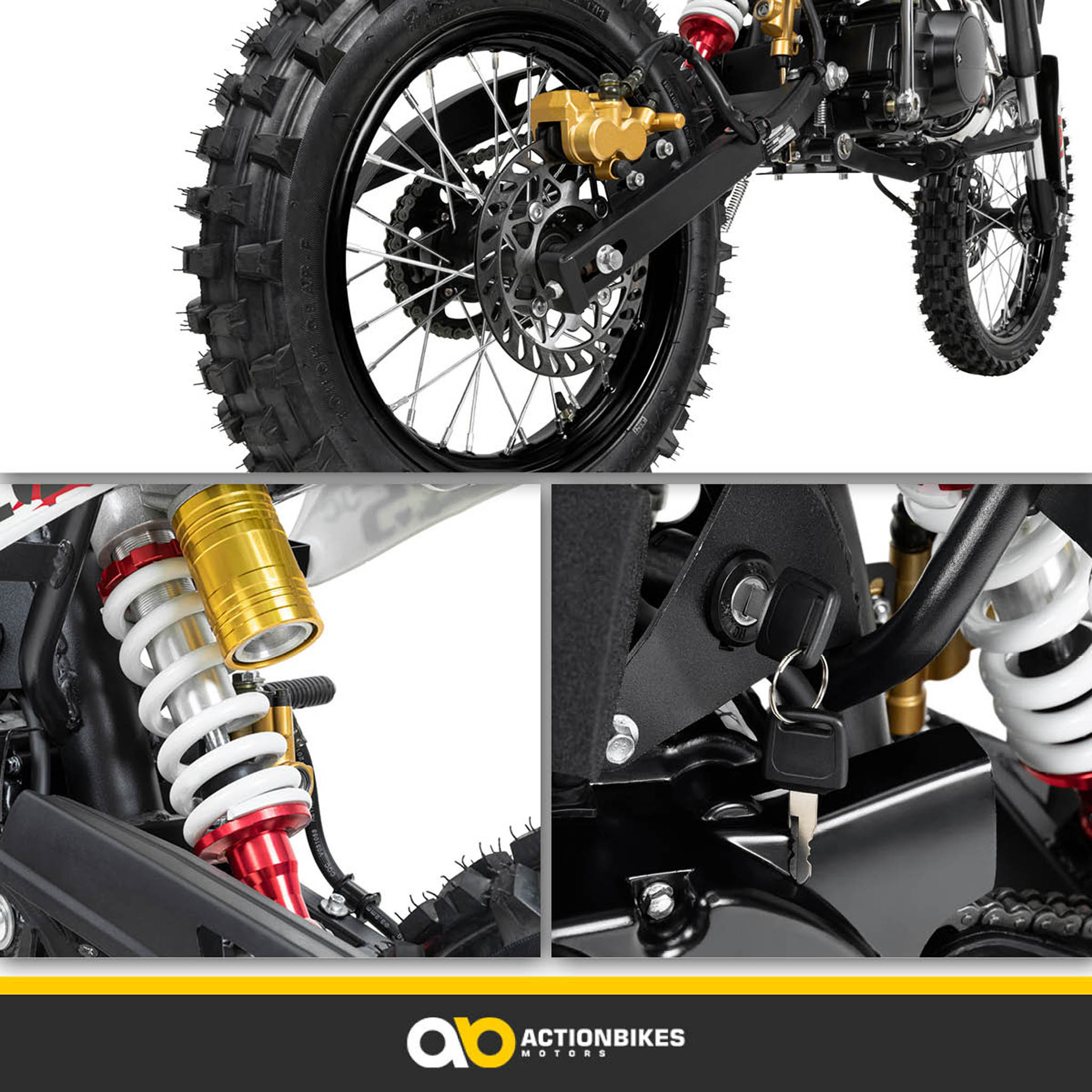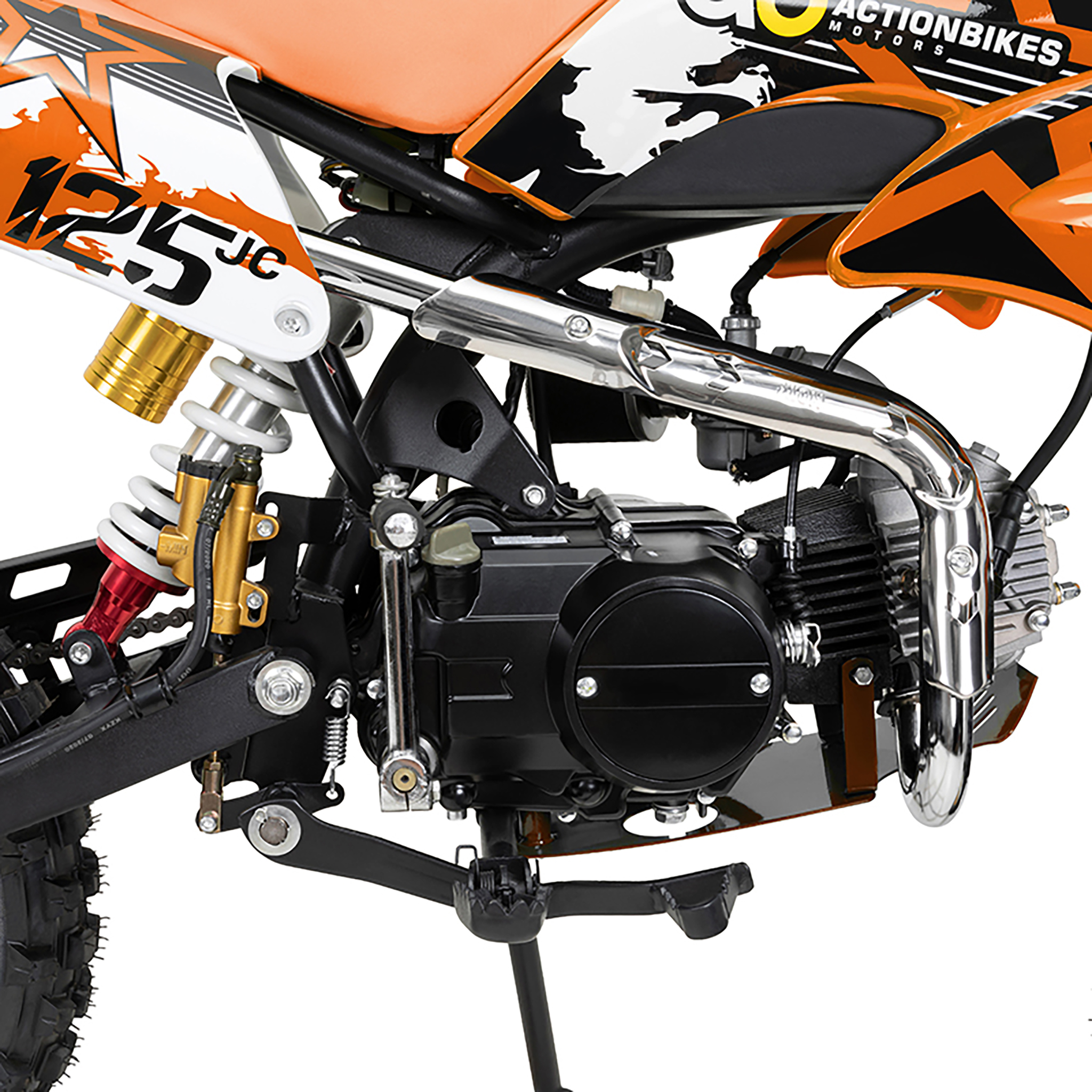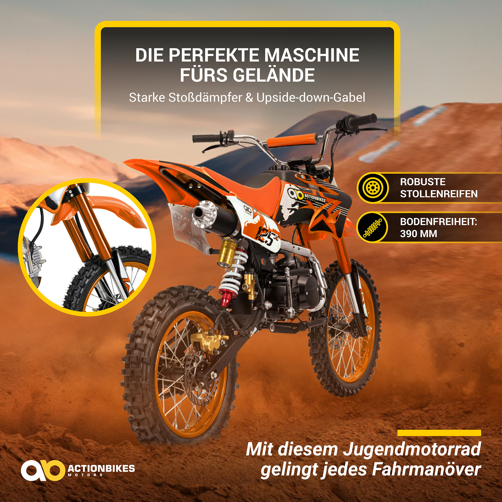 Getreu dem Motto „ab durch die Hecke“ geht es beim Motocross quer durch Wälder und über Felder. Dennoch kommt mit Actionbikes der Komfort nicht zu kurz. Denn im Jugend-Crossbike JC125 sind vorne zwei und hinten ein Stoßdämpfer verbaut.