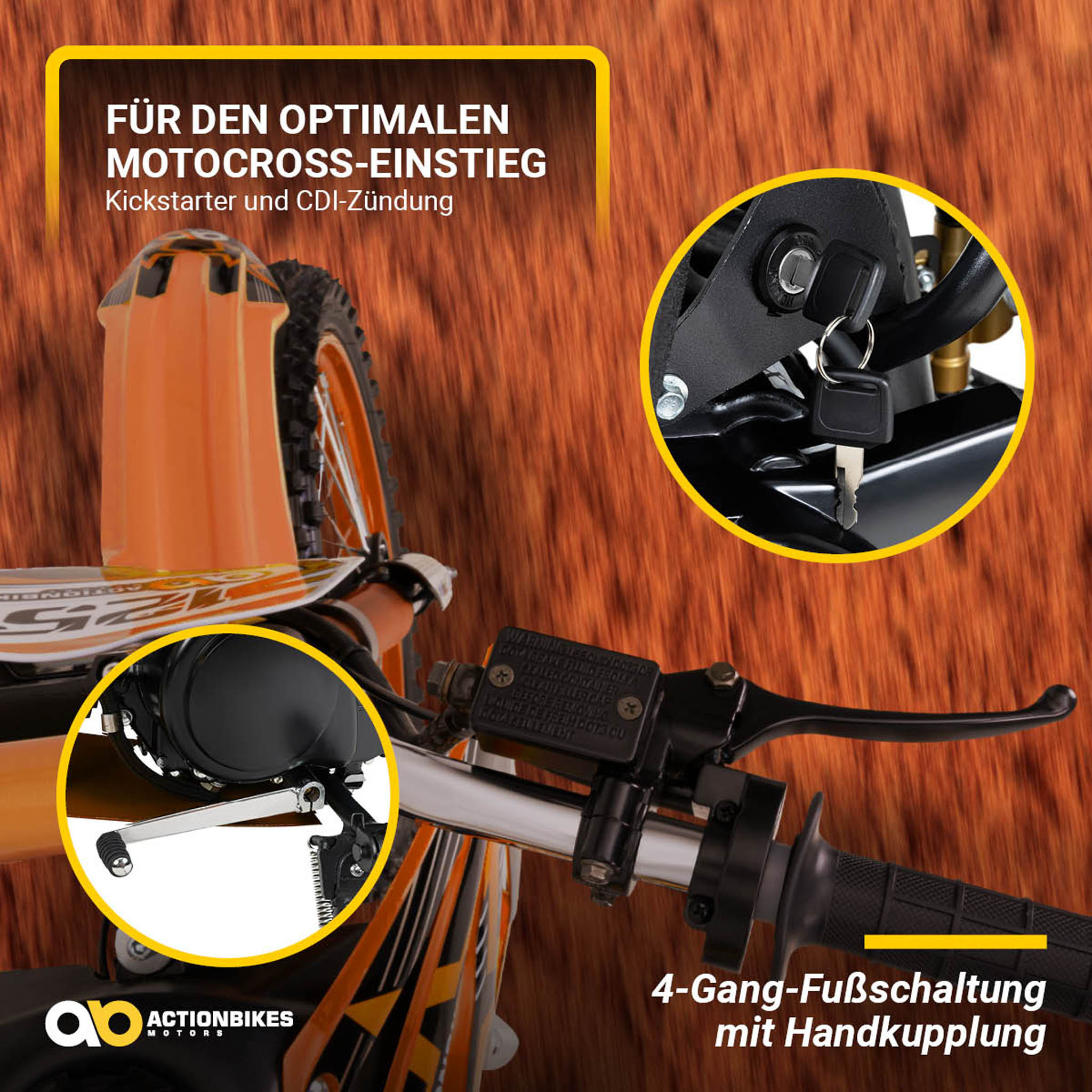 Das Starten des Motors erfolgt über den sogenannten Kickstarter. Dabei wird das Jugend-Crossbike einfach mit dem Fuß mittels eines „Kicks“ angetreten. Schon kann die Fahrt losgehen.
