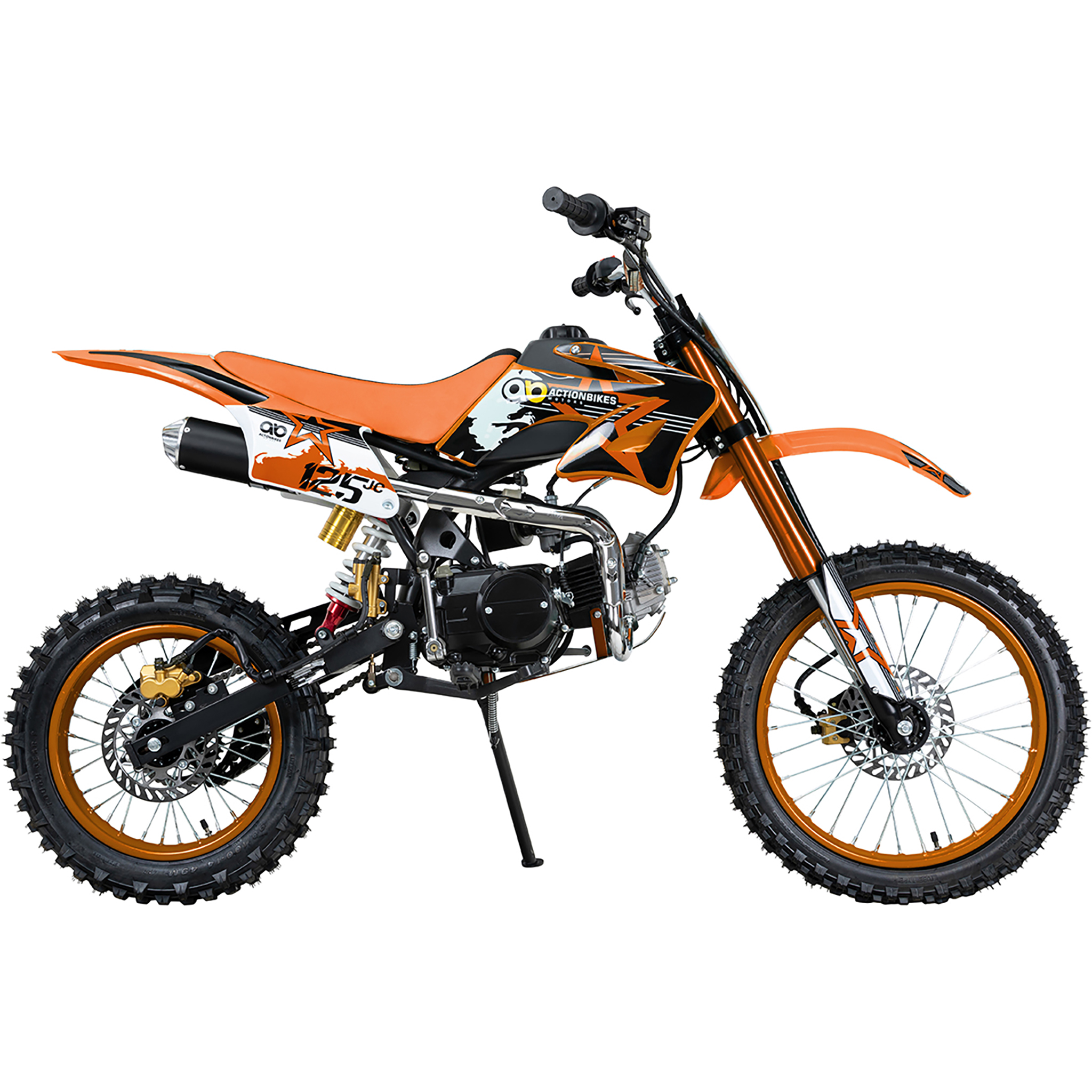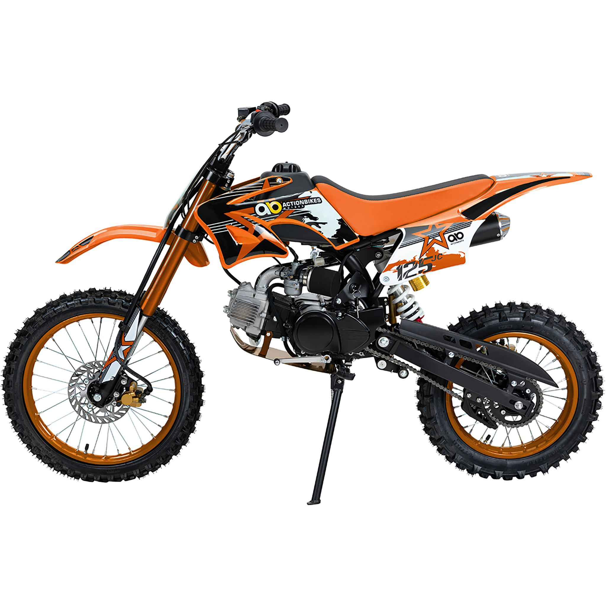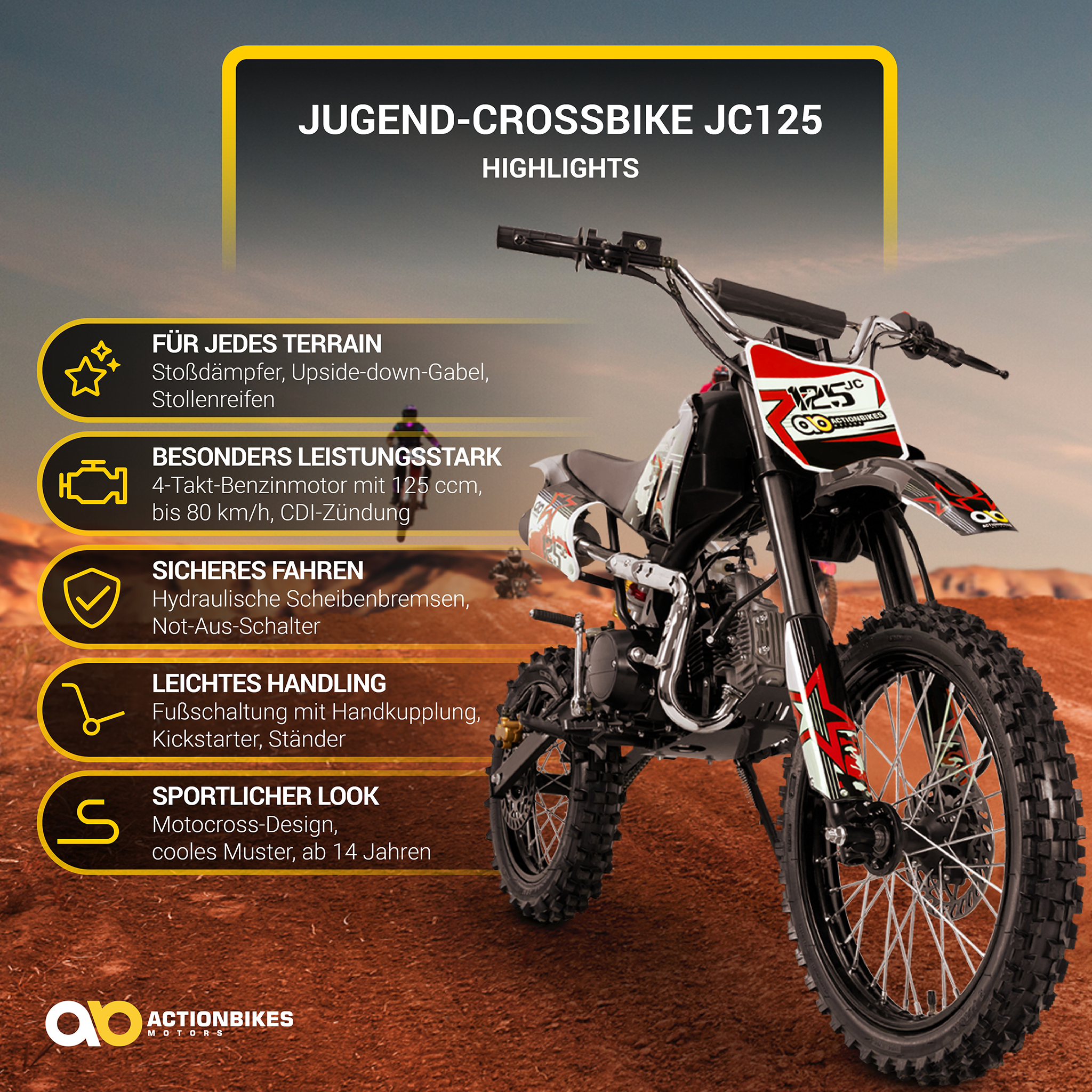 Das Jugend-Crossbike JC125 ist der Inbegriff von spritzigem Fahrspaß auf der Outdoor-Strecke. Damit entdecken Kids Motocross als ein neues, aufregendes Hobby und bleiben freiwillig von Handy, Bildschirm und Co. weg. Die Stoßdämpfer und die Upside-Down-Gabel federn sämtliche Unebenheiten gekonnt ab. Eine große Bodenfreiheit von 390 mm und die robusten Stollenreifen machen jede Tour mit dem Jugend-Crossbike komfortabel. Der leistungsstarke 4-Takt-Benzinmotor sorgt dabei für den nötigen Adrenalinschub. Mit diesem Jugend-Crossbike hat der Nachwuchs ab 14 Jahren die Möglichkeit, mit viel Tempo das neue Gelände zu entdecken. Lassen Sie sich überzeugen: Dieses Jugend-Crossbike von Actionbikes wird auch Ihr Sprössling nicht mehr missen wollen!
