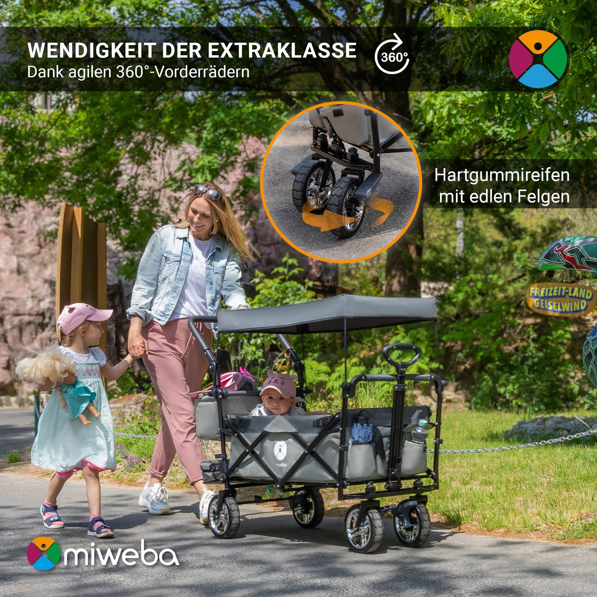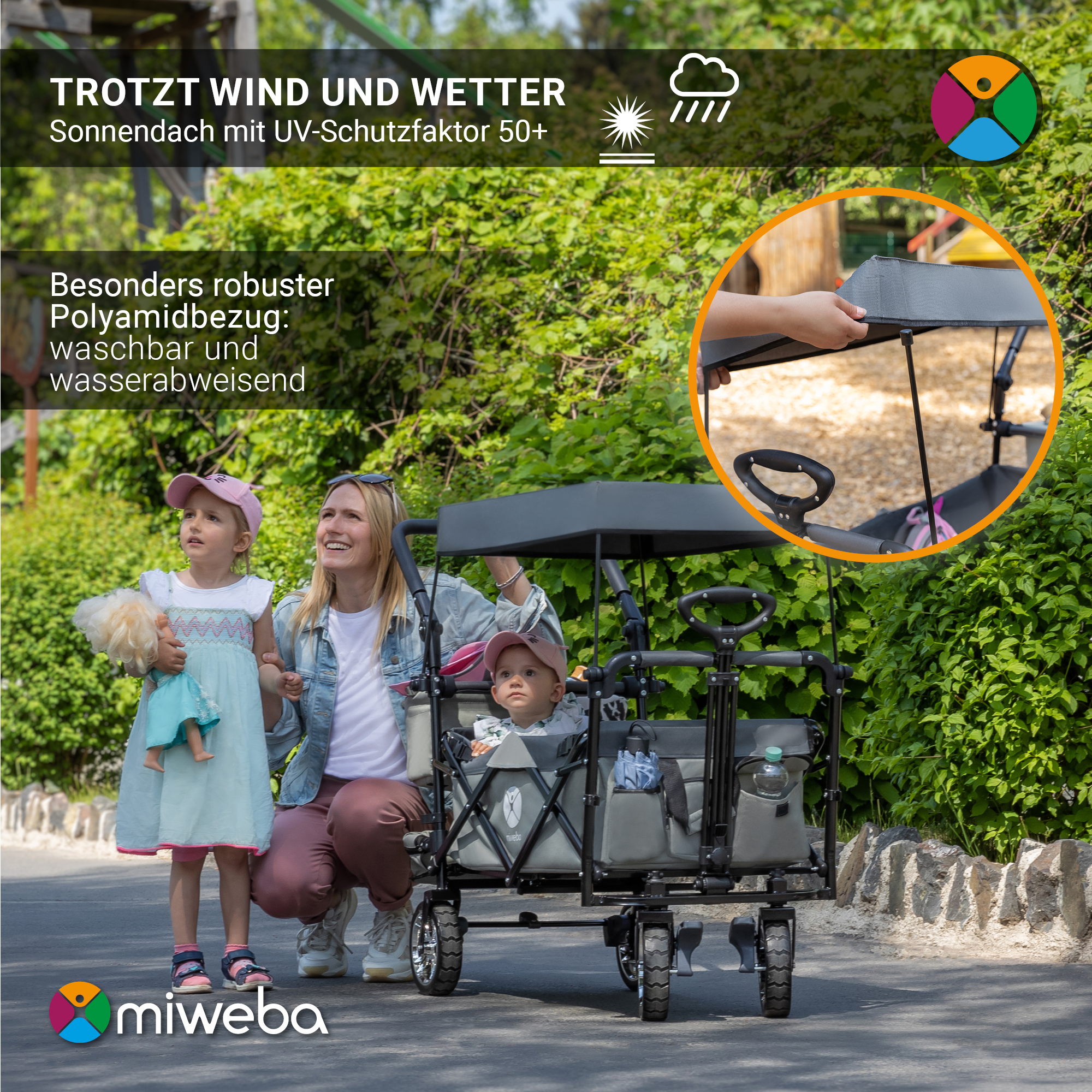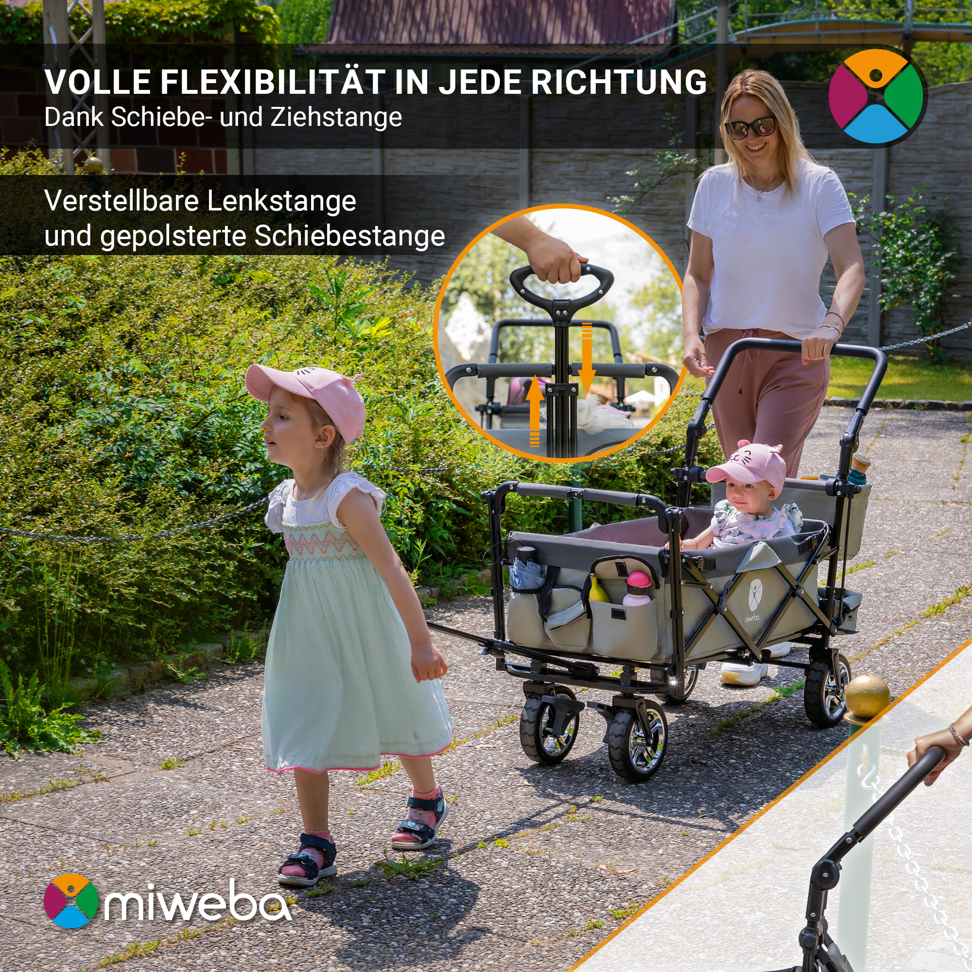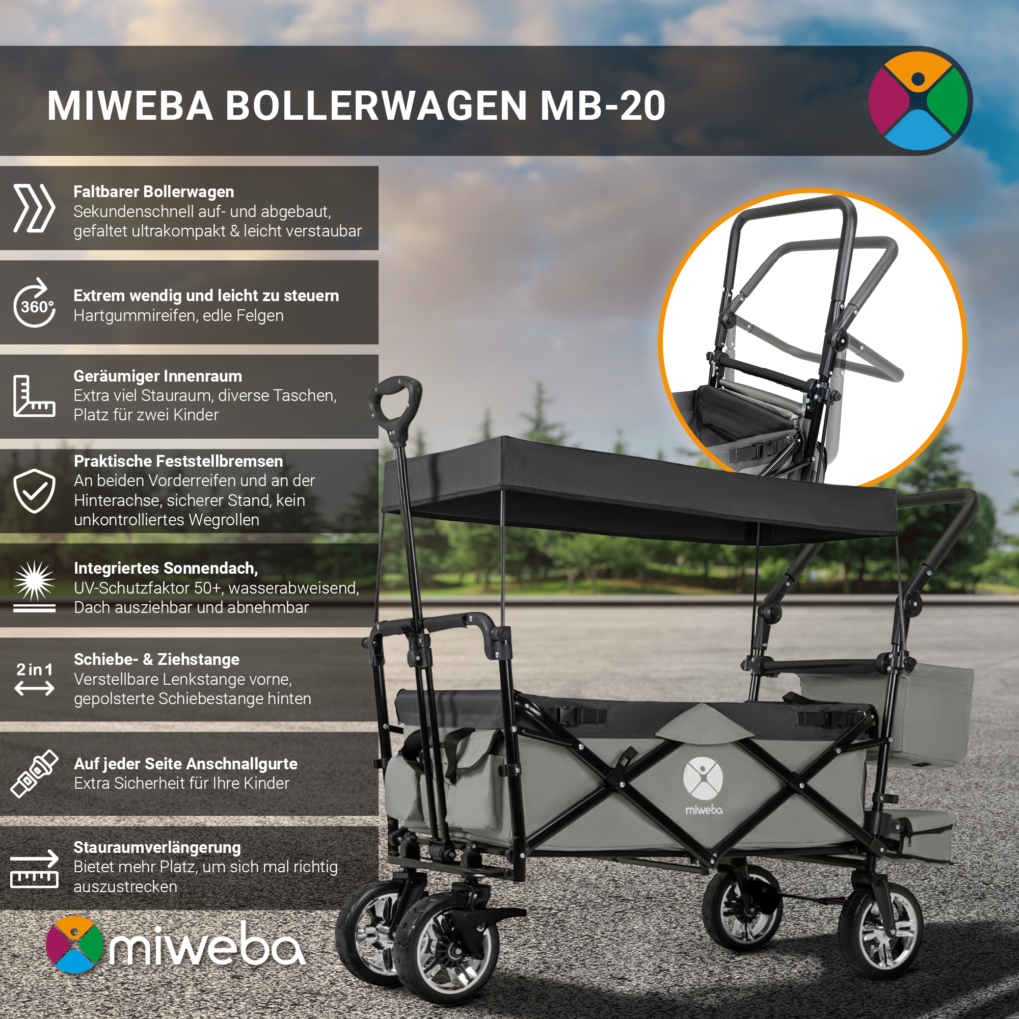 Miweba Bollerwagen MB-20 faltbar, Sonnendach, Schiebe- & Zugstange, Stauraumverlängerung, 360°-Räder