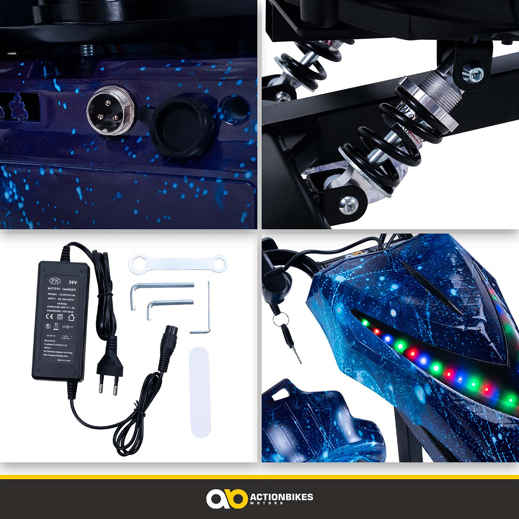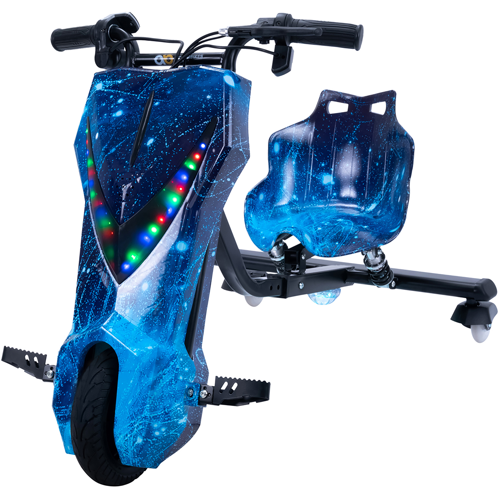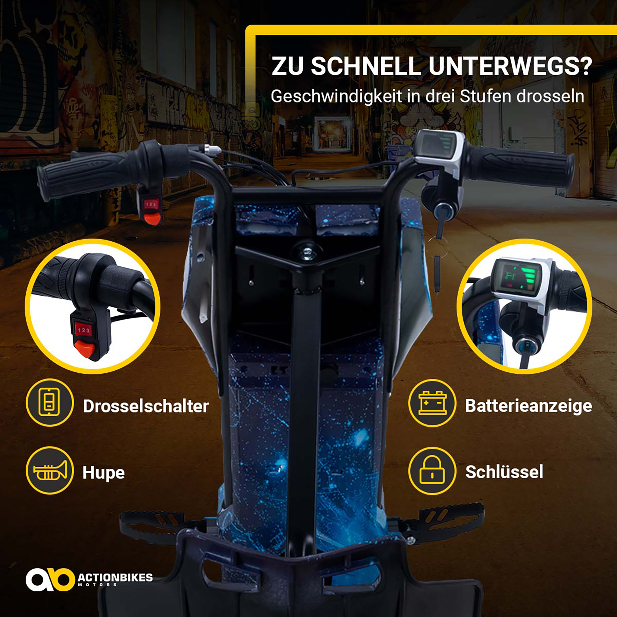 Dieser Actionbikes Drift-Scooter beeindruckt mit einem ausgefallenen Design. Wählen Sie aus fünf Farbvarianten: Hier ist ein Muster stylischer als das andere. Ob kosmisches Lila oder planetares Blau, cooles Schwarz-Grün, Rot mit Spiderman-Optik oder minimalistisch matt Weiß – das Elektro-Drift-Trike für Kinder fällt mit Sicherheit auf! Und eins ist klar: Die futuristische Optik macht die genialen Fahrmanöver noch eindrucksvoller.