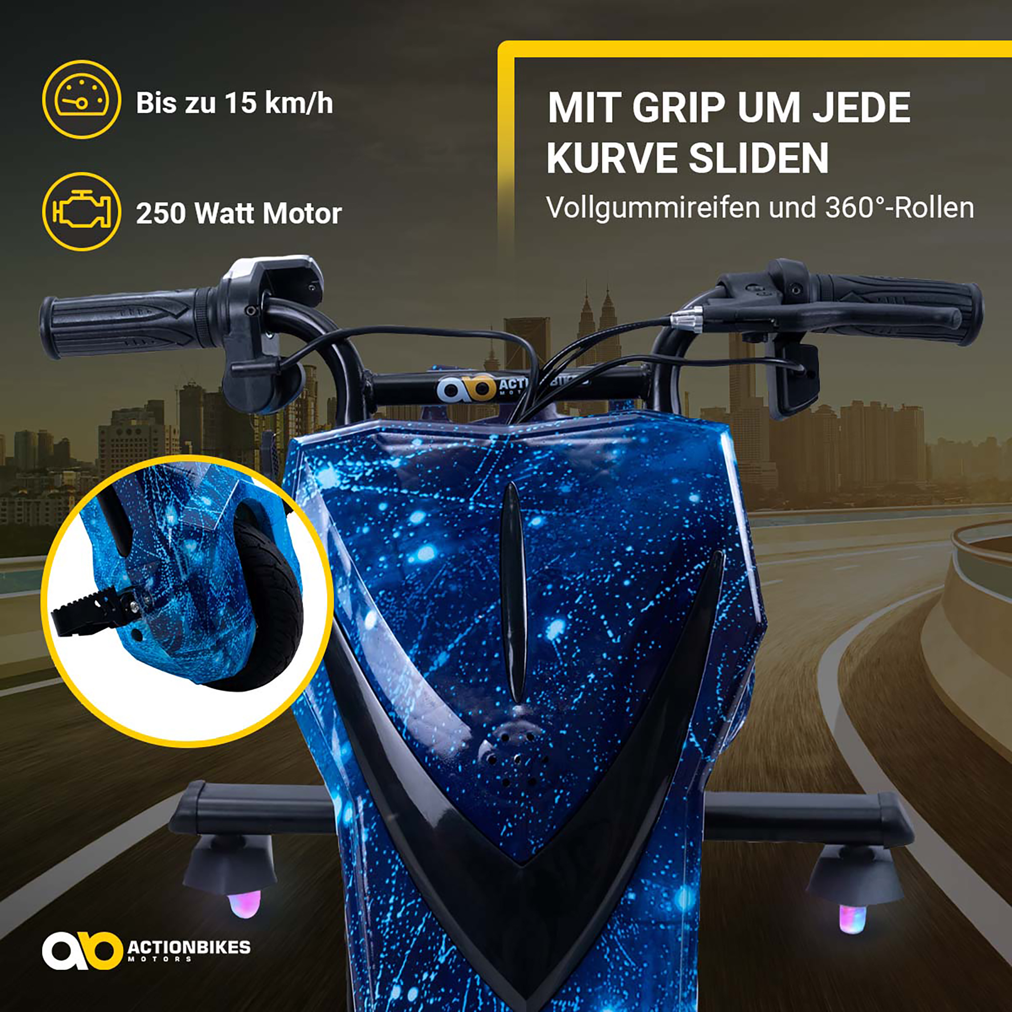 Kinder stecken voller Abenteuerlust und Entdeckergeist: Das Elektro-Drift-Trike von Actionbikes liefert genau dafür den perfekten Stoff! Spaßige Stunden und eindrucksvolle Tricks sind garantiert. Denn die speziellen 360°-Rollen am Trike ermöglichen rasante Drifts. Mit dem 250-Watt-Motor erreicht der Drift-Scooter eine Geschwindigkeit von bis zu 15 km/h. Aber keine Sorge – die Sicherheit Ihrer Sprösslinge haben Sie trotzdem stets im Blick: Denn mithilfe des Drosselschalters bestimmen Sie die Geschwindigkeit des Elektro-Drift-Trikes für Kinder. Und auch eine Hupe sowie eine Vorderbremse sind am Drift-Trike vorhanden. Dem sicheren Spaß steht also nichts mehr im Wege: Mit blinkenden LED-Rollen, leuchtender Front, peppiger Musik und auffälligem Design lässt der Elektro-Drift-Scooter Kinderherzen höherschlagen.