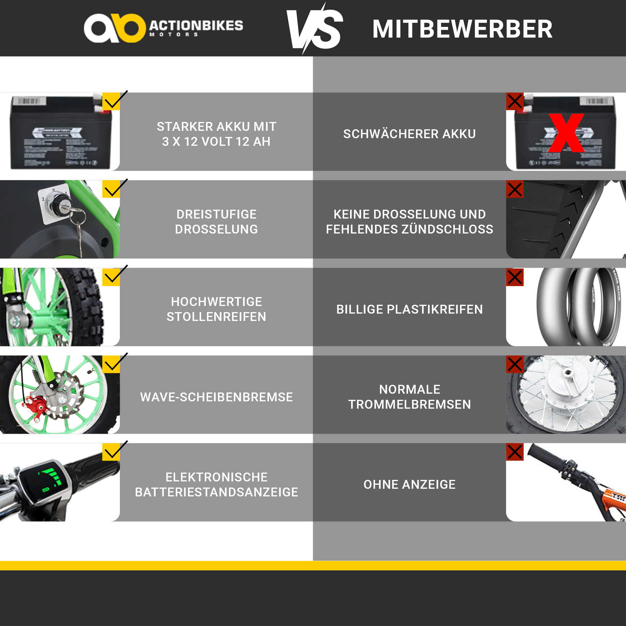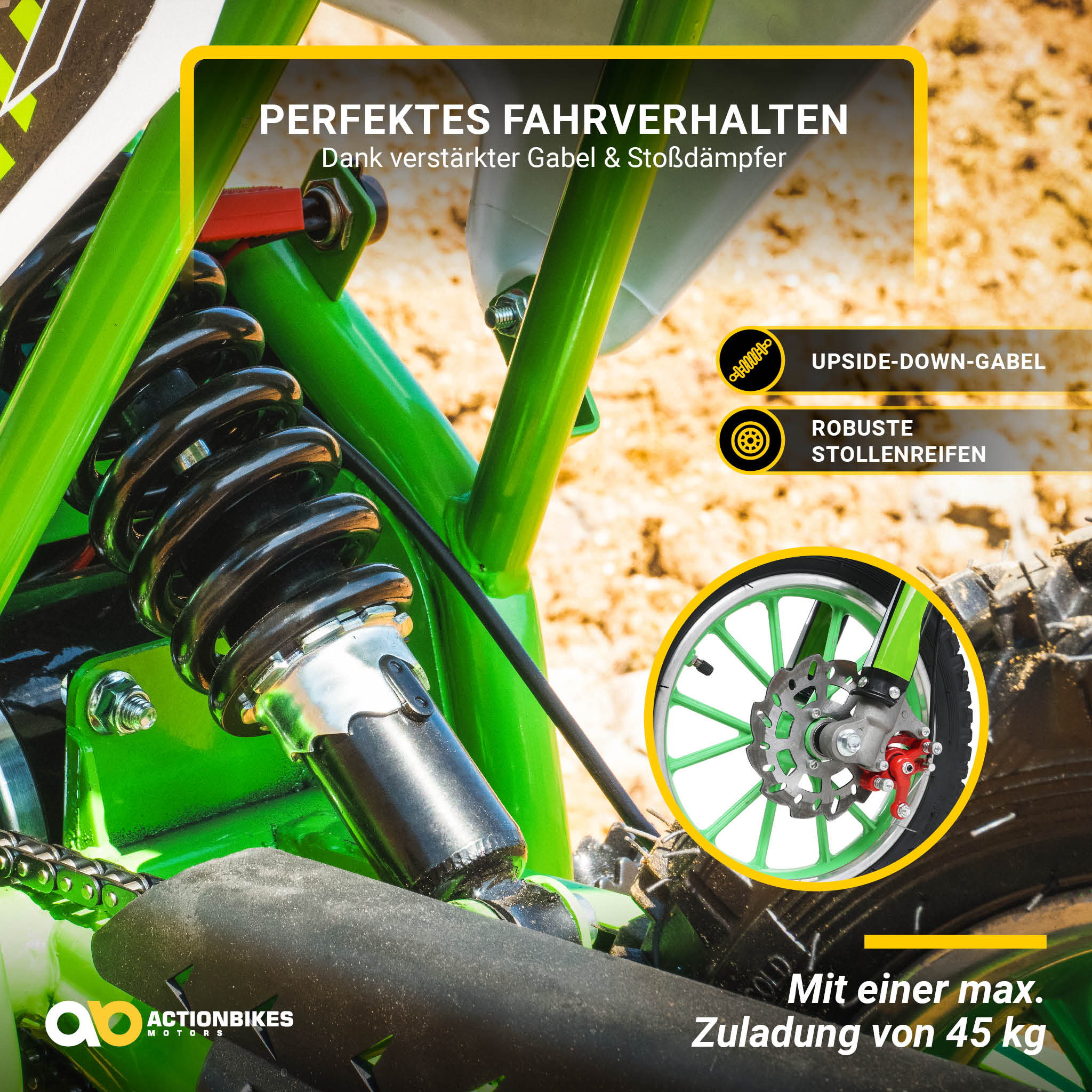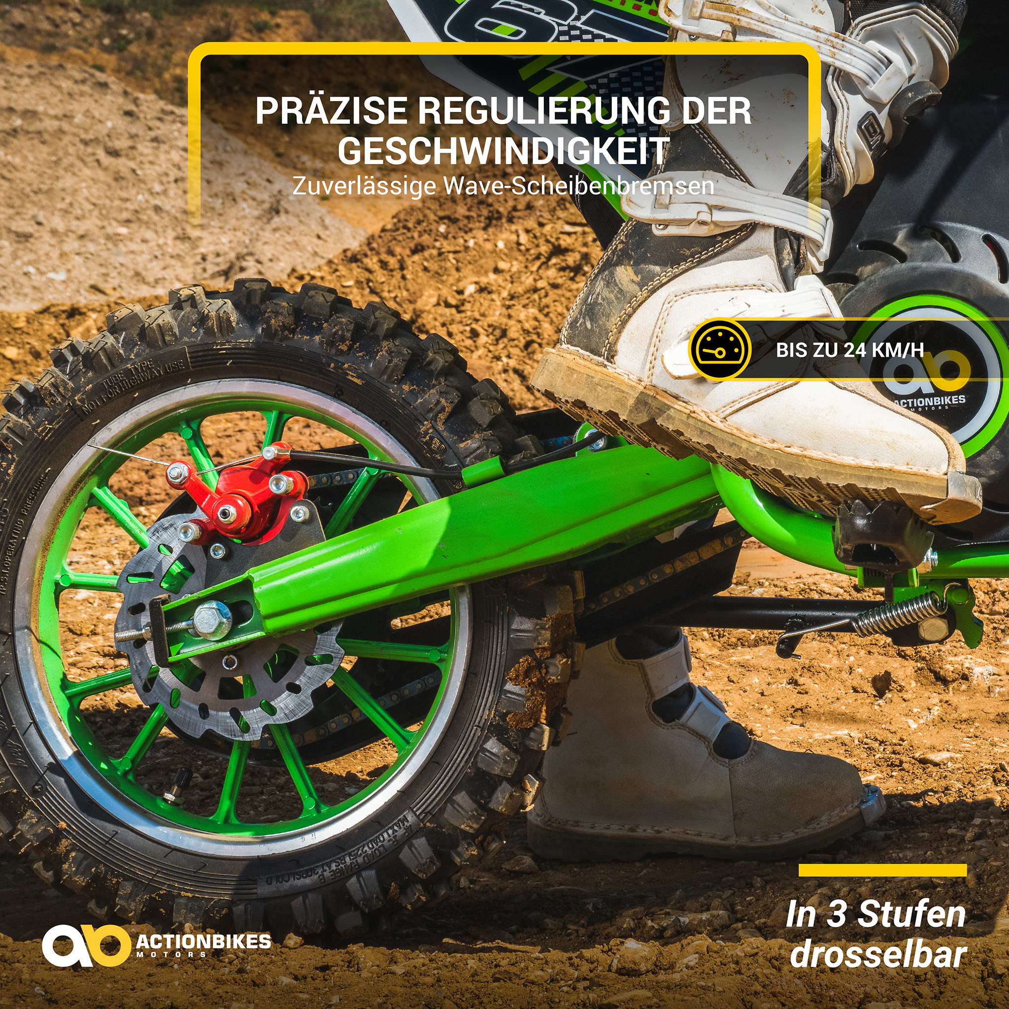 Gerade beim Kinder-Motocross spielt die Beschleunigung eine große Rolle. Deshalb ist das Dirt-Bike mit einem starken 1.000-Watt-Elektromotor mit 36 Volt ausgestattet. Damit legt der Nachwuchs einen spritzigen Start hin.