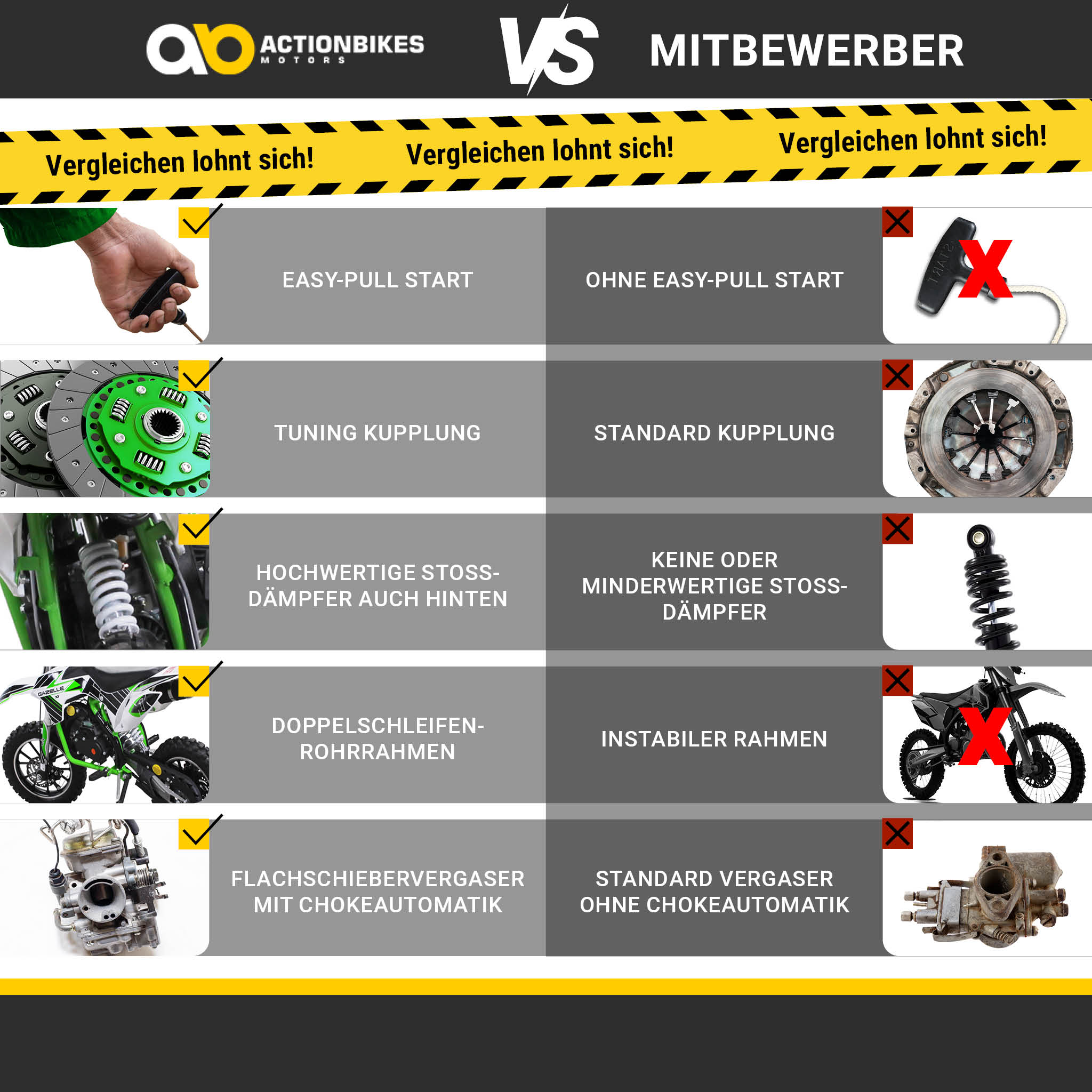 TOP! Hätte mir nicht gedacht um diesen Preis so ein TOPBIKE zu erhalten. Hatte mich auf bastelein an Vergaser Seilzügen usw. eingestellt, aber das Bike funktioniert einfach nur super. Mein Sohn (6) ist hellauf begeistert. Man kann (muss) das Teil drosseln, es geht mit der kleinsten Drossel schon voll ab und hat richtig Kraft! Lieferung Verpackung usw. wie immer perfekt. Service ist sehr gut, Händler meldet sich schnell und ist kompetent. (Vorteil ist, dass es eine deutsche Firma ist!) Sind jetzt schon einige male gefahren. Der Sound und der Lärm und der Gestank sind für Motorfans perfekt. Absolut zu empfehlen!!