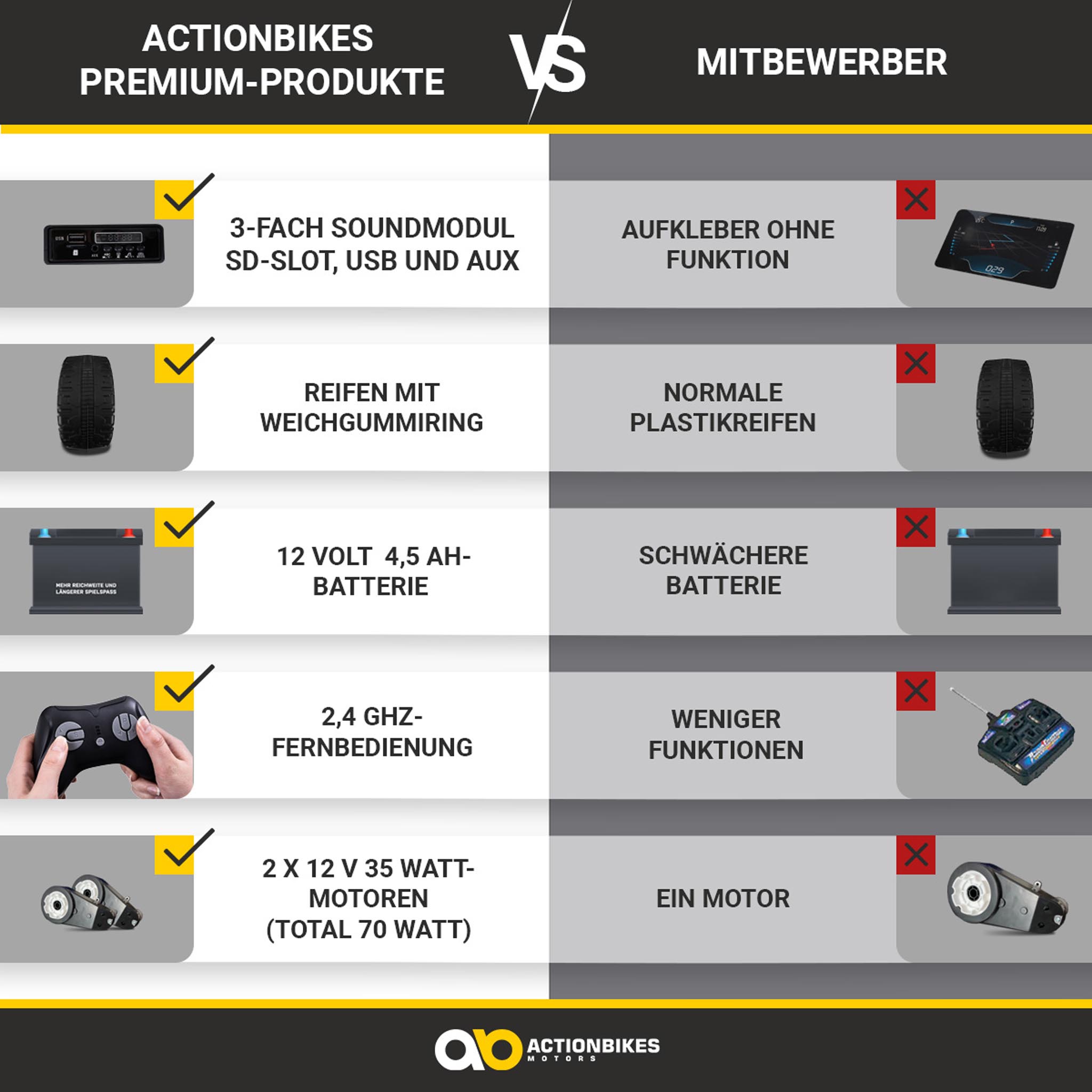 | Weitere Funktionen: | Motorsound beim Starten, Soft-Start, Transportbügel, LED Display mit Batteriestandanzeige |