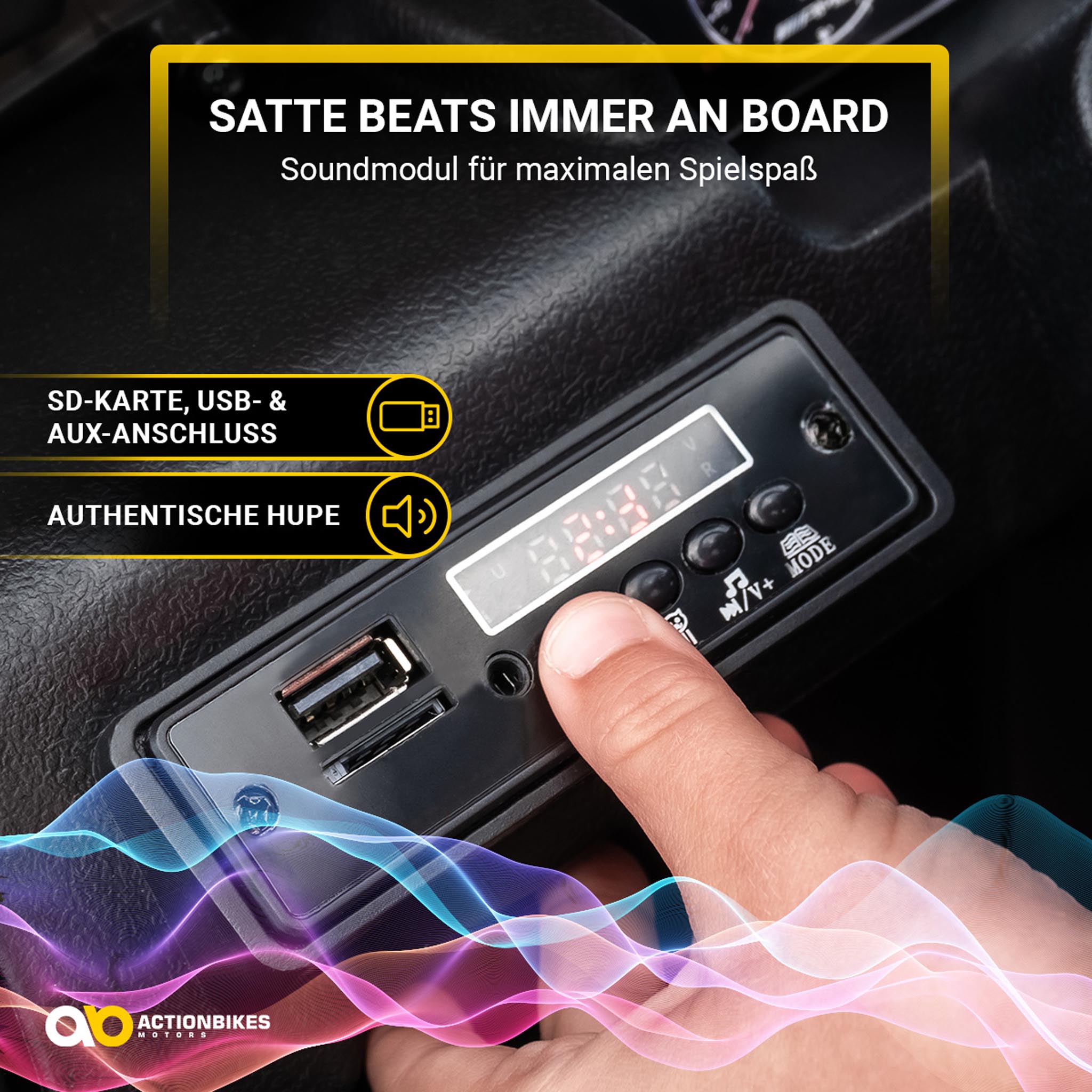Auf der lässigen Spritztour darf coole Musik nicht fehlen. Deshalb überzeugt das Kinder-Elektroauto Mercedes AMG G63 W463 mit vielseitigen Audiofunktionen. Damit lassen sich ruckzuck alle Lieblingslieder oder Hörspiele abspielen. Dafür stehen Ihnen ein USB-Port, ein AUX-Anschluss und ein SD-Slot zur Verfügung.