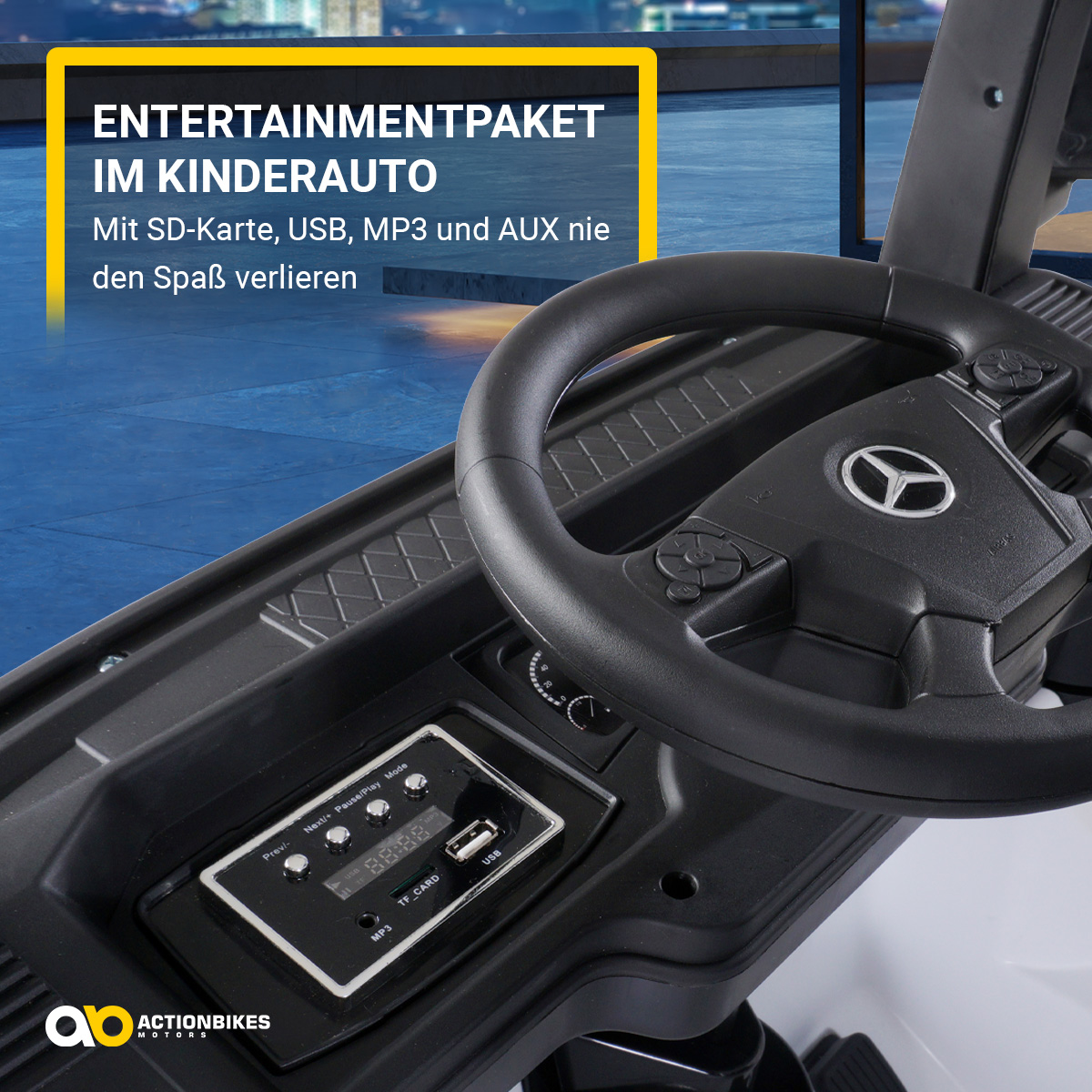 An Bord des Kinder-Trucks ist auch an die Unterhaltung gedacht. Über USB oder ein AUX-Kabel lassen sich verschiedene Ausgabegeräte anschließen. Weiterhin verfügt das Mercedes-Kinderauto über einen SD-Kartenslot. Während der Fahrt kann Ihr Kind MP3s abspielen und seine Lieblingslieder oder ein spannendes Hörspiel genießen. Wiedergabe und Lautstärke lassen sich dabei ganz einfach am Lenkrad steuern.