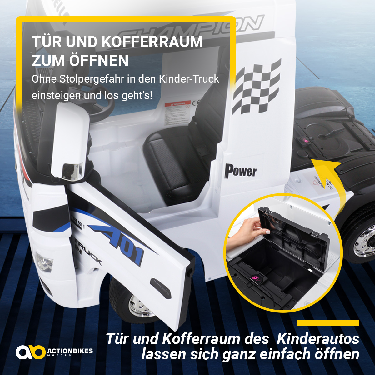 Unsere Actionbikes-Elektroautos sind so schick wie die Großen und lassen Ihren Nachwuchs die Faszination des LKW-Fahrens erleben.