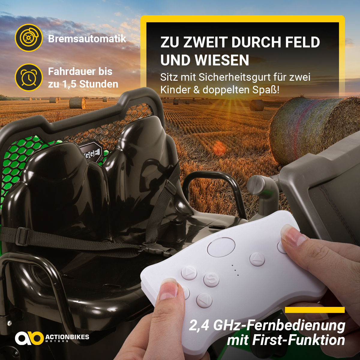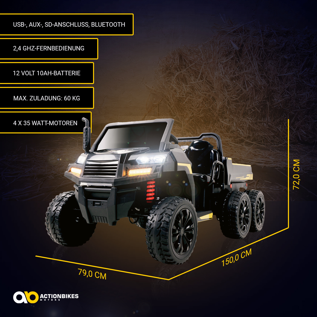 Von diesem flotten Powerpaket im rustikalen Landfahrzeug-Stil werden Ihre Kinder begeistert sein. Vier kraftvolle Motoren treiben die EVA-Vollgummireifen des Kinder-Elektroautos auch durch anspruchsvolles Gelände an. Die großzügig bemessene Kippmulde verwandelt das Spaßmobil in einen echten Erntehelfer, wenn nicht gerade die eigenen Schätze von A nach B transportiert werden sollen. Der mit einem 3-Punkt-Sicherheitsgurt ausgestattete Sitz ermöglicht sogar doppelten Spaß, denn hier finden gleich zwei Kinder Platz. Noch mehr Sicherheit bieten Bremsautomatik und Fernbedienung inklusive Stopp- und First-Funktion. High- und Low-Speed-Einstellungen sorgen für einen ganz besonderen Fahrspaß - abgerundet durch das überzeugende Entertainment-Paket mit tollen Extras.