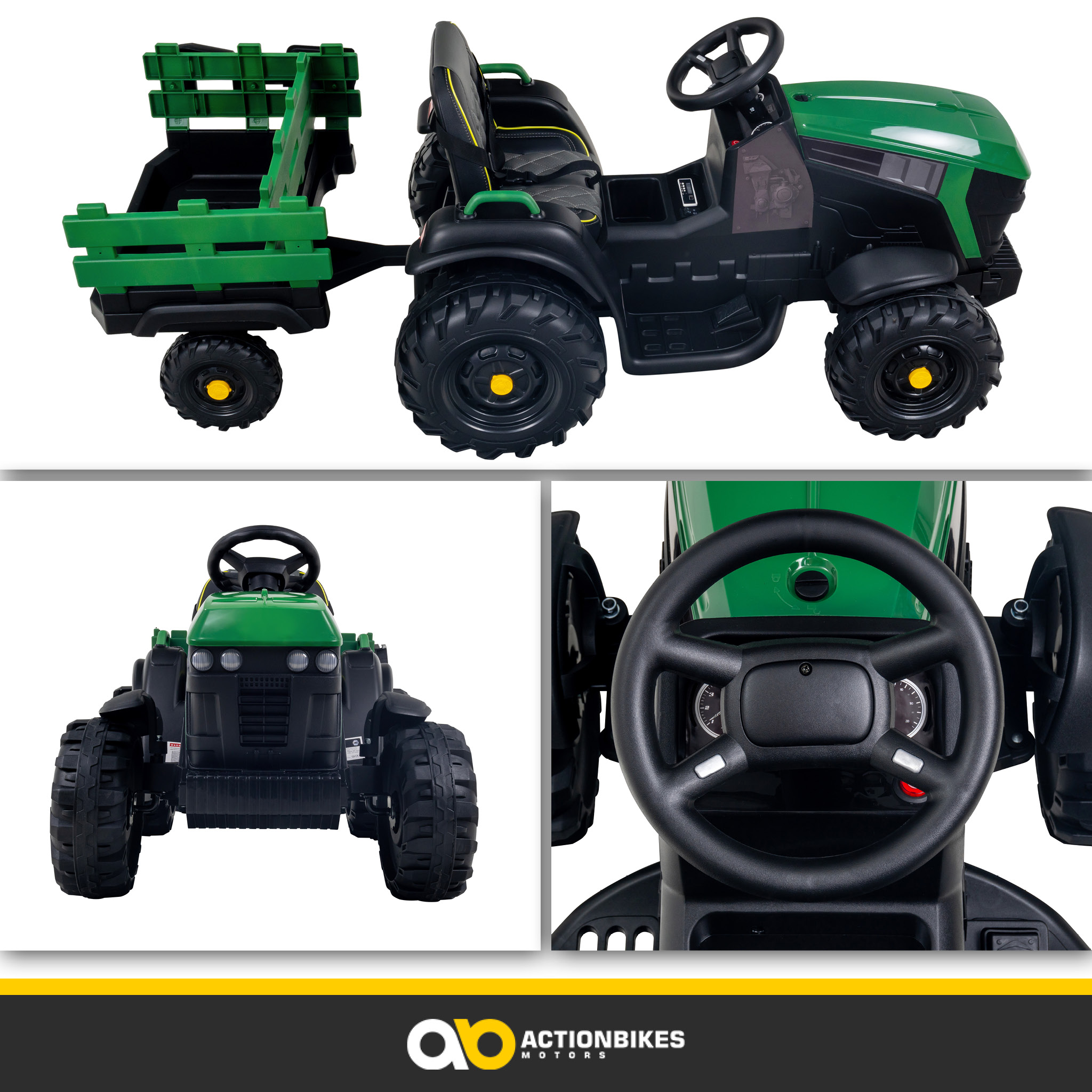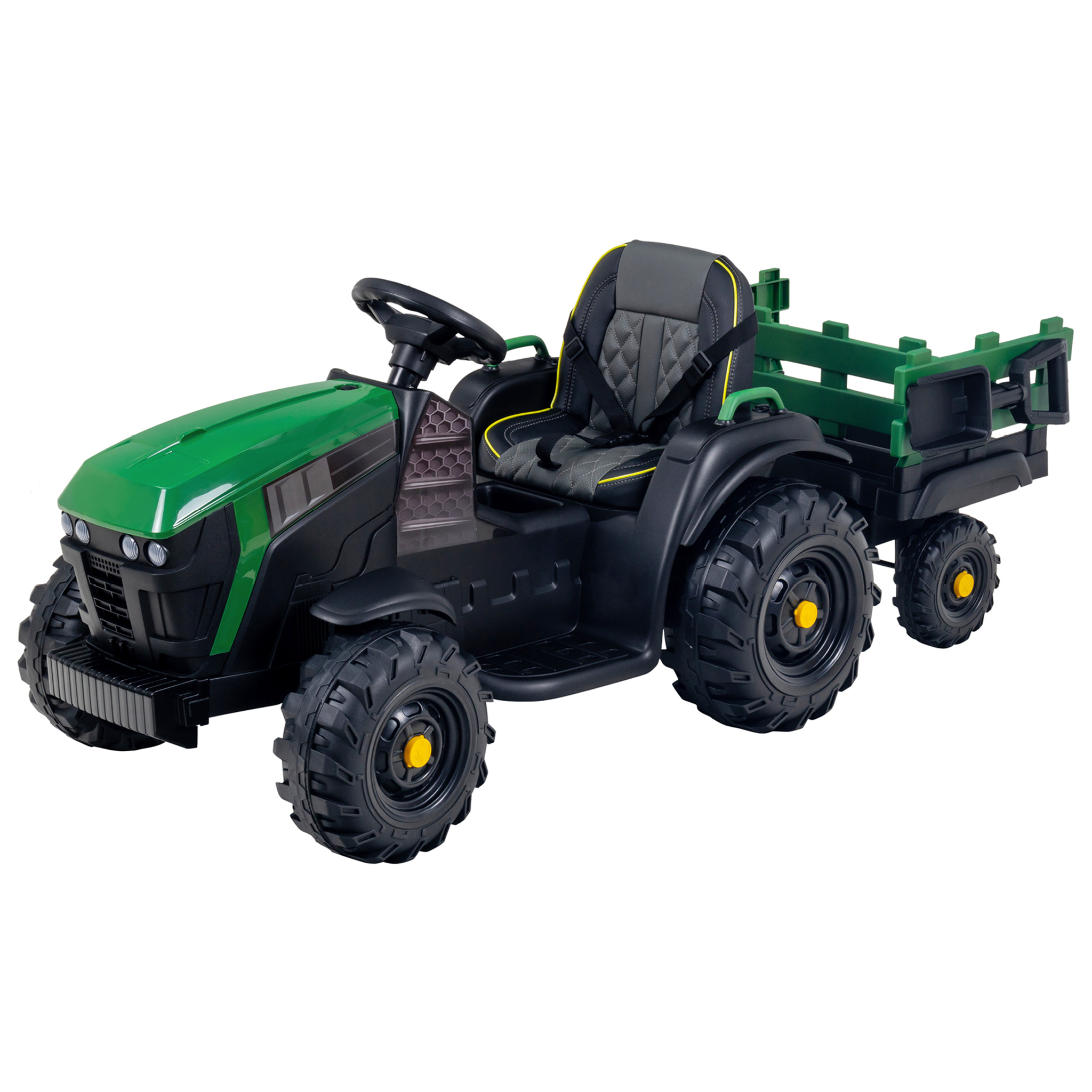 An den hochwertigen Details erkennen Sie, dass Sie mit diesem Elektro-Kindertraktor mit Anhänger nicht auf irgendein Spielzeug setzen. Der Sitz wirkt durch Kunstleder nicht nur sehr echt, er ist auch äußerst bequem. Und das ist nicht unwichtig. Sobald die Kinder am Steuer Platz genommen haben, werden sie sich nur schweren Herzens wieder davon lösen können. Denn eines ist klar: Mit diesem spürbaren Luxus macht sogar die harte Arbeit auf dem Feld richtig Spaß.