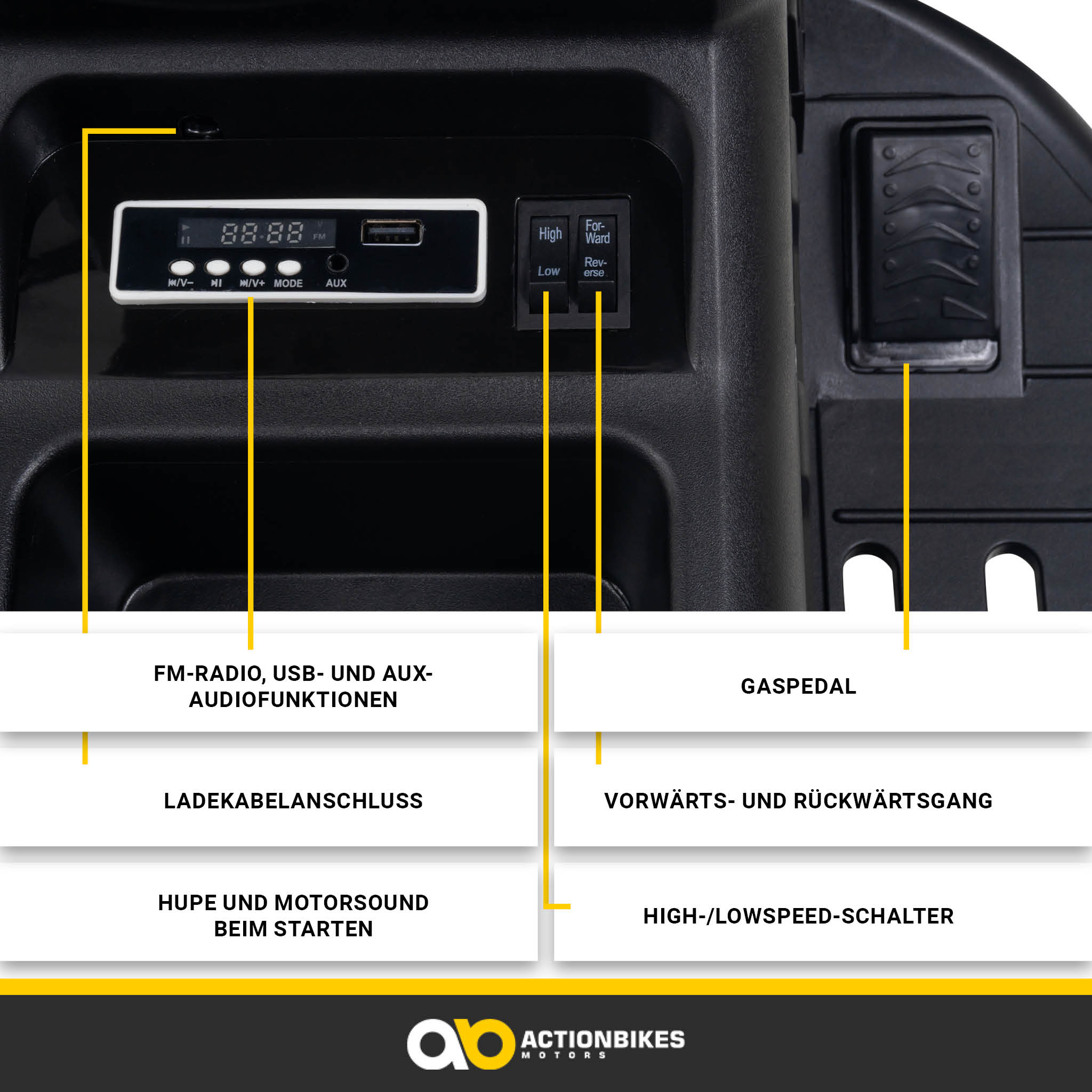 | Weitere Funktionen: | Soft Start, Motorsound beim Starten, Staufach, High-/Lowschalter, Haltegriffe |
