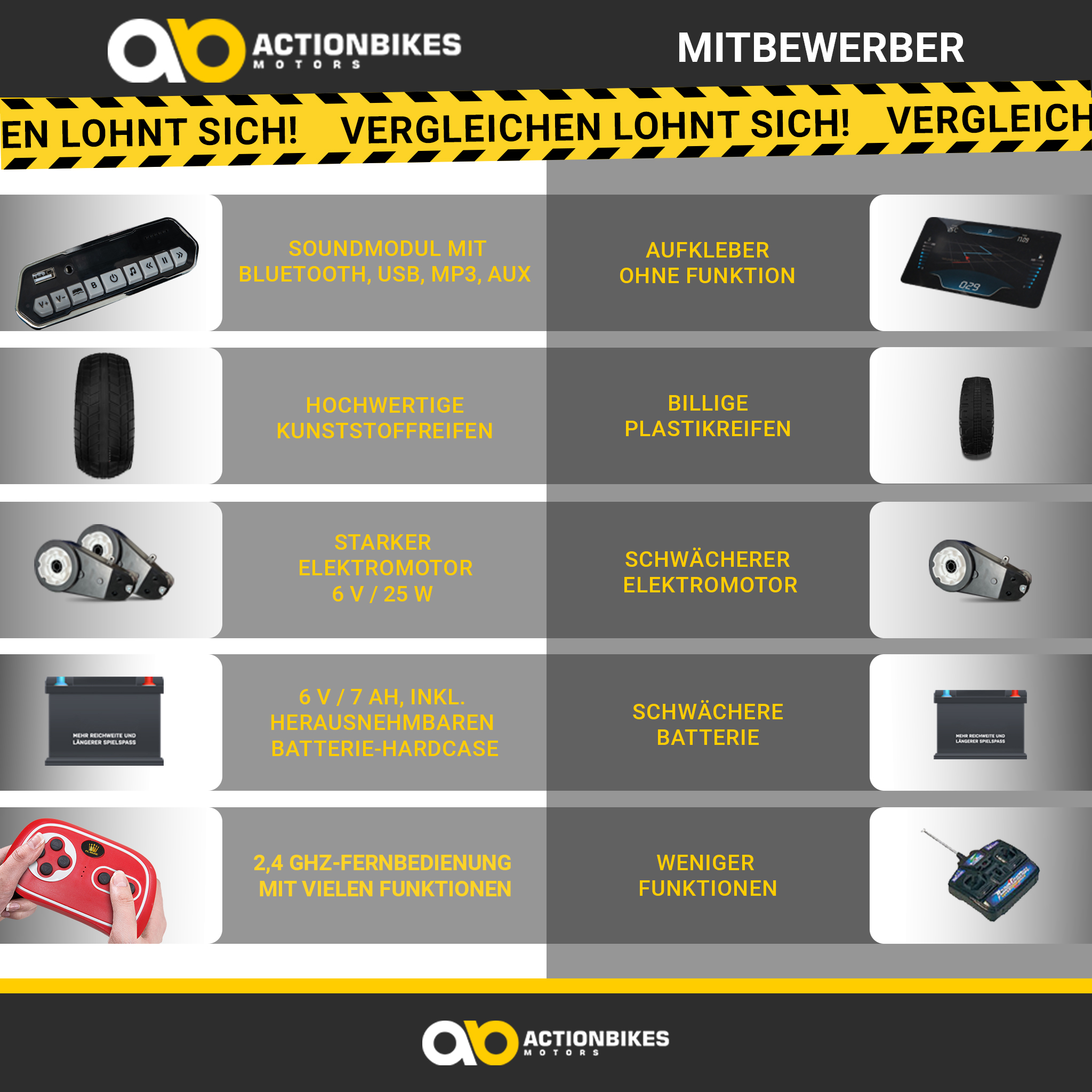 Zusätzlich sorgt der realistische Motorsound beim Starten für noch mehr Spaß. Mit dem Sound für die Hupe können Ihre Kids perfekt auf sich aufmerksam machen.