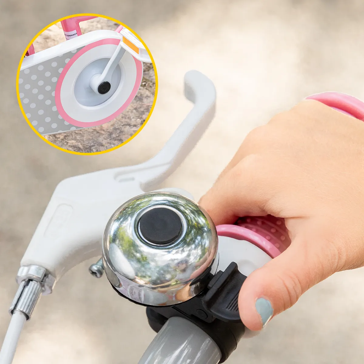 Mädchenhand auf Lenker, Daumen greift nach silberner Klingel, vergrößerter Kettenschutz
