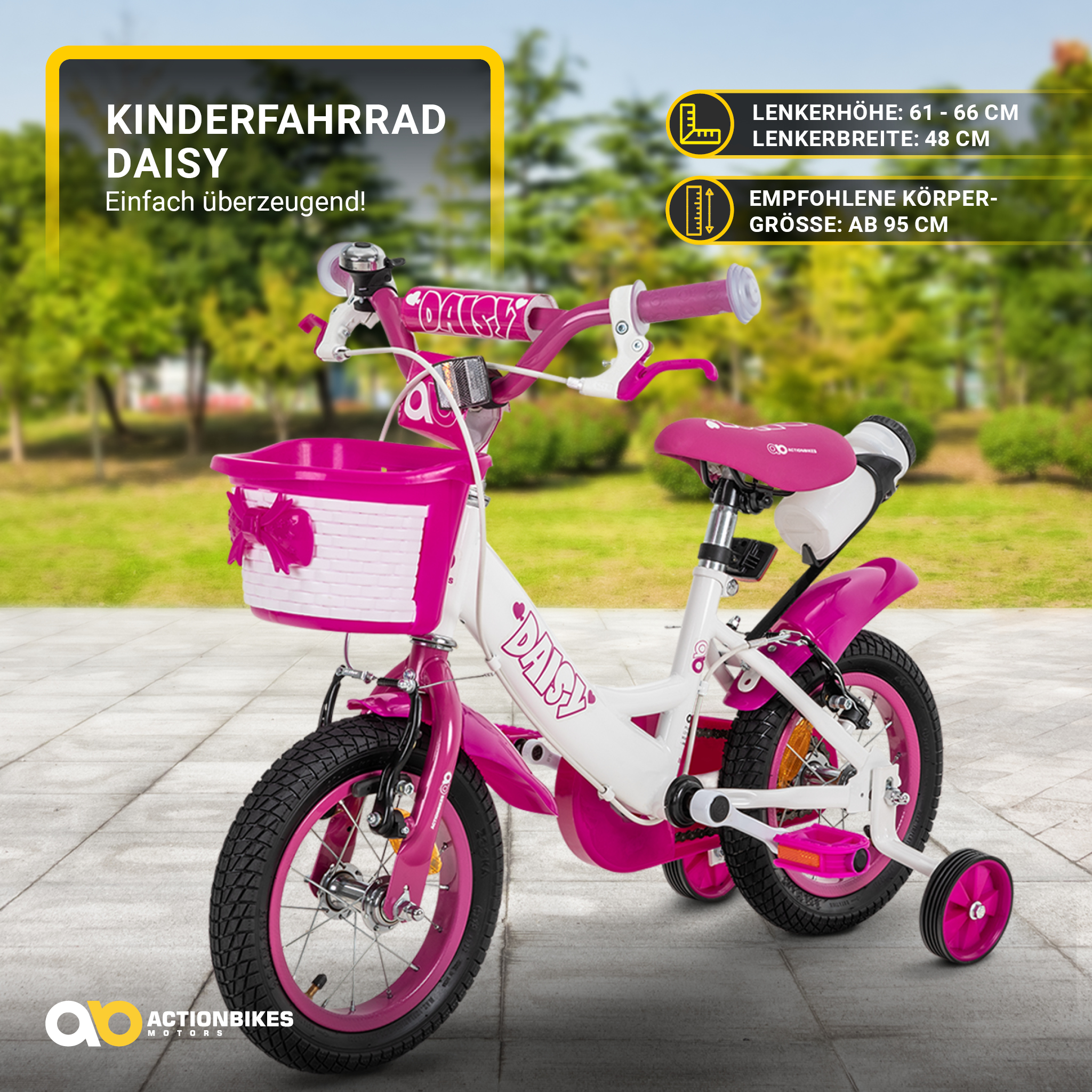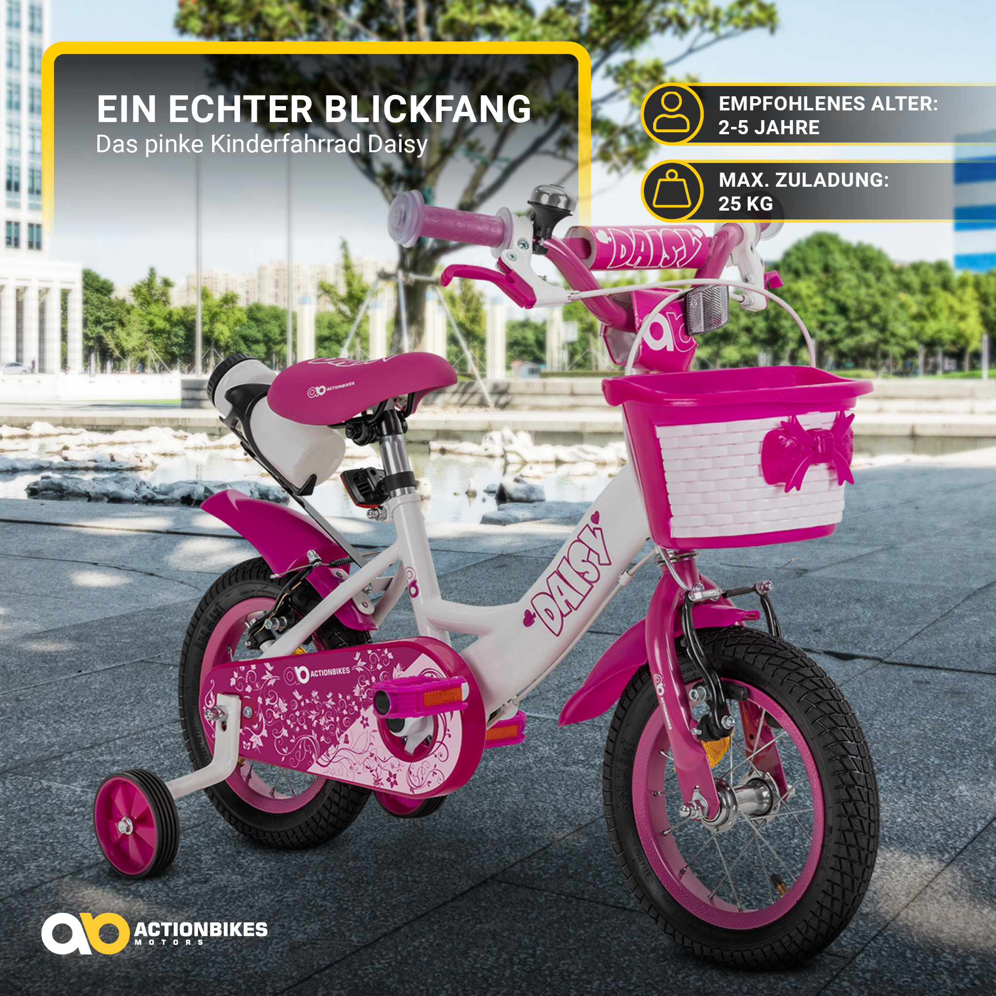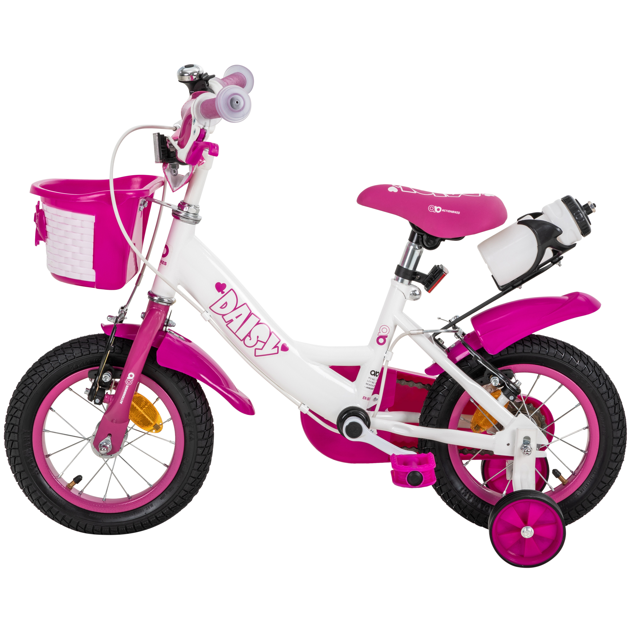 Mit diesem Fahrrad für Kinder werden Sie jede kleine Prinzessin begeistern: Das 12-Zoll-Kinderfahrrad Daisy präsentiert sich nicht nur in Pink, sondern mit allen Accessoires, die ein Mädchenherz höherschlagen lassen - bis hin zum verspielt designten Korb, der ausreichend Platz für das Lieblingskuscheltier oder die Lieblingspuppe bietet. Selbstverständlich ist dieses Kinderfahrrad optimal auf die Bedürfnisse von kleinen Fahranfängern abgestimmt: Sichere Bremsen, eine lautstarke Klingel und sinnvolle Schutzbleche gehören zu den Selbstverständlichkeiten - und der Preis wird Sie überzeugen.