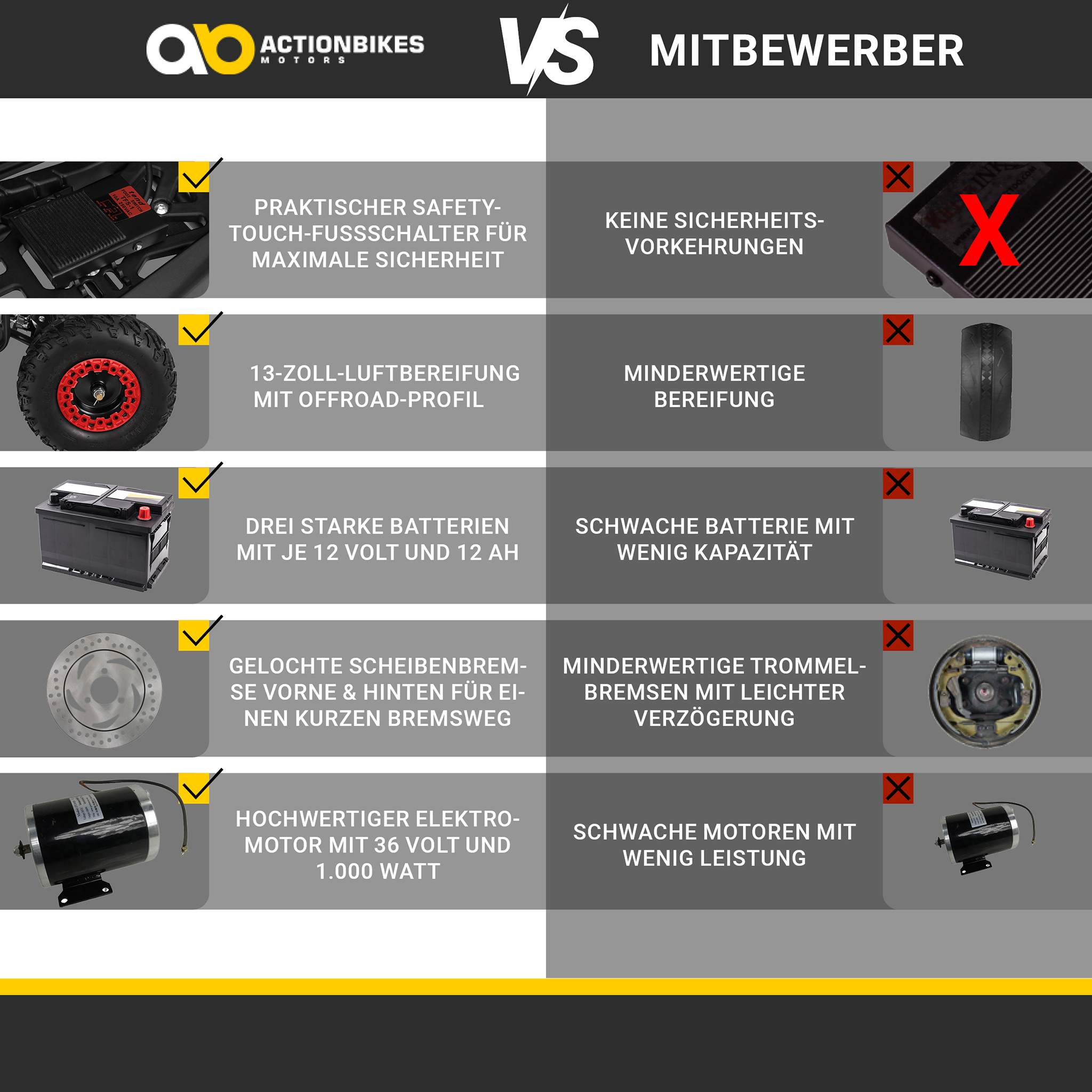 Der starke Elektromotor des Kinder-Elektroquads Racer begeistert mit seiner Leistung. 1.000 Watt bei 36 Volt Spannung liefern eine maximale Geschwindigkeit von 25 km/h. Lassen Sie Ihr Kind unbesorgt im Garten oder über Feldwege sausen. Auch Steigungen schafft dieses Elektroquad für Kinder spielend. Und alles ohne Abgase, die unangenehm riechen und Gesundheit und Umwelt belasten. Der Antrieb läuft nahezu geräuschlos, was besonders für kleinere Kinder ein Vorteil ist. Zu guter Letzt überzeugt der wartungsarme Elektromotor mit seiner Langlebigkeit. Der Spaß mit dem Kinderquad ist damit garantiert!