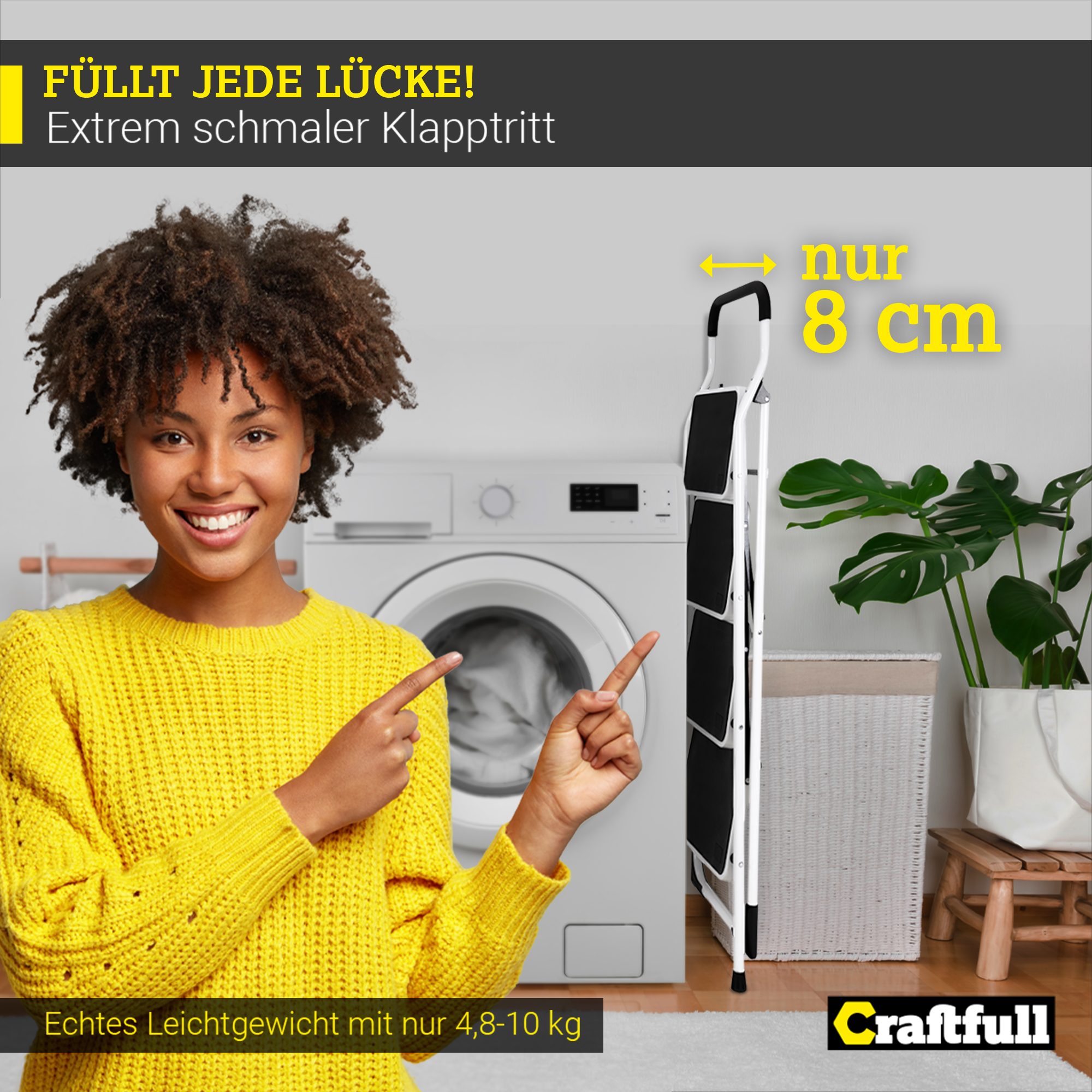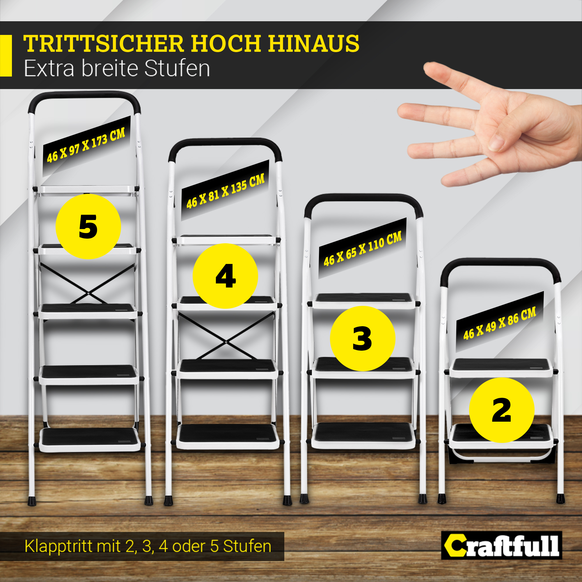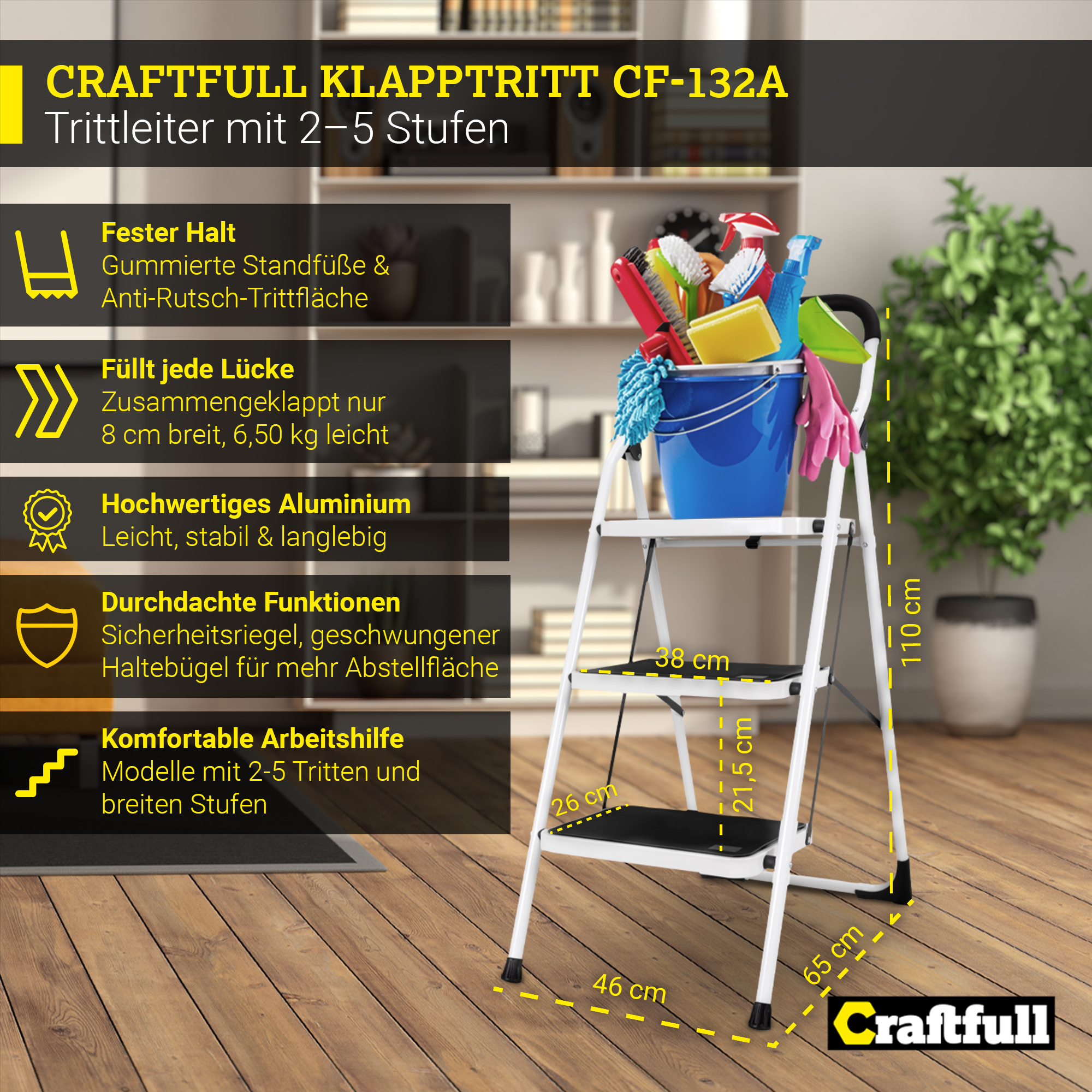 Ein Klapptritt sollte in keinem Haushalt fehlen. Spinnweben in der oberen Ecke entfernen, ein neues Bild aufhängen, Vorhänge anbringen, Reparaturen erledigen – all das ist mit dem Craftfull Klapptritt CF-132A kein Problem! Damit die Haushalsleiter für Ihre Anforderungen genau richtig ist, gibt es sie mit zwei, drei, vier oder fünf Stufen. Dementsprechend variiert die Höhe zwischen 86 cm und 160 cm.