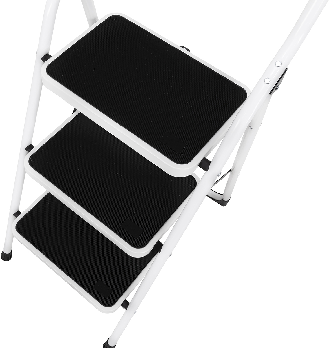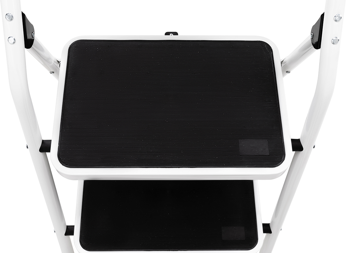 Sicherheit: | Anti-Rutsch Trittfläche, Gummifüße, Gepolsterter PVC-Haltegriff oben, Sicherheitsbügel |