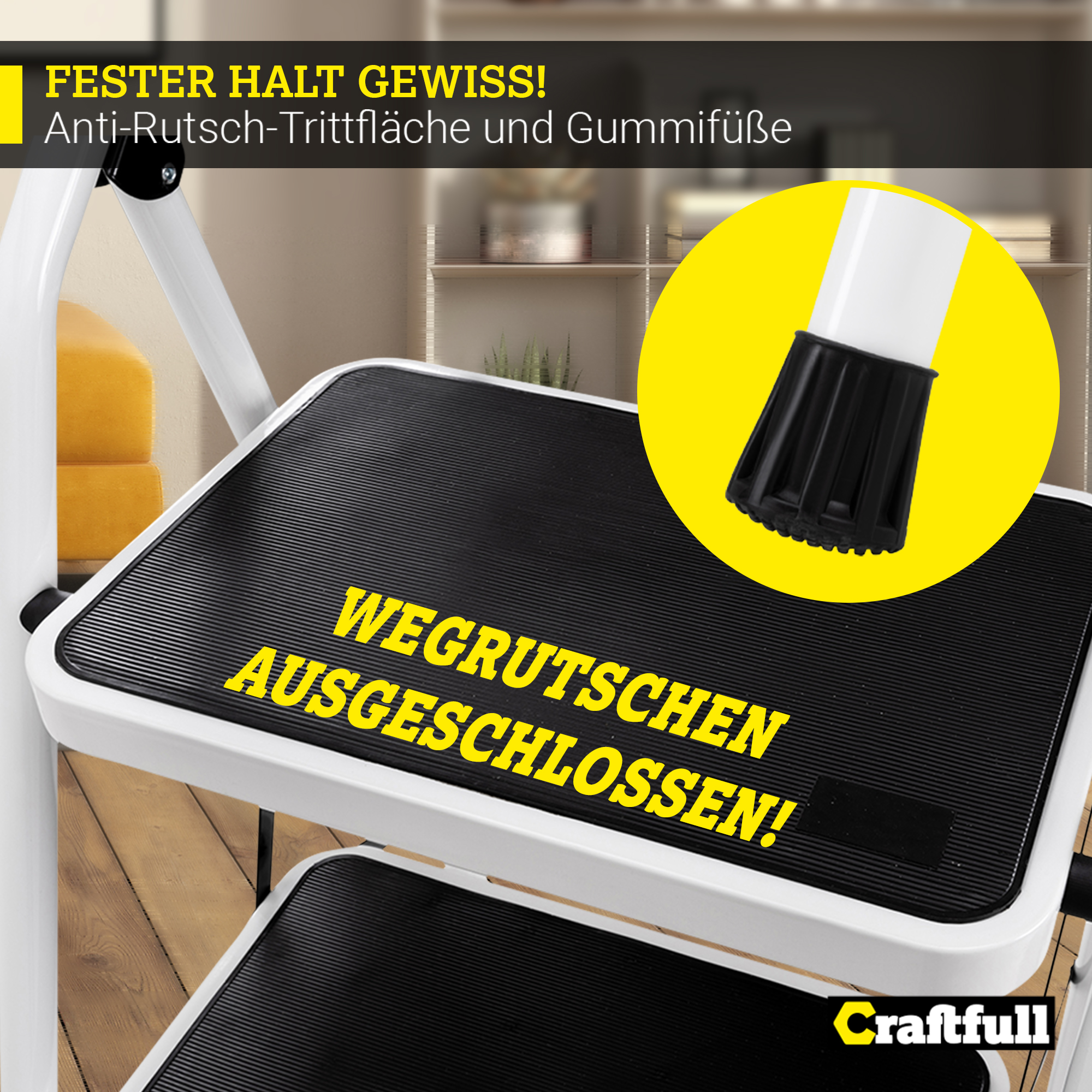 Das Ausbalancieren auf einer Leiter fällt nicht immer leicht. Die wichtigste Voraussetzung: ein fester Stand! Genau dafür ist der Craftfull Klapptritt CF-132A mit Gummifüßen ausgestattet. Diese verhindern ein Wegrutschen.