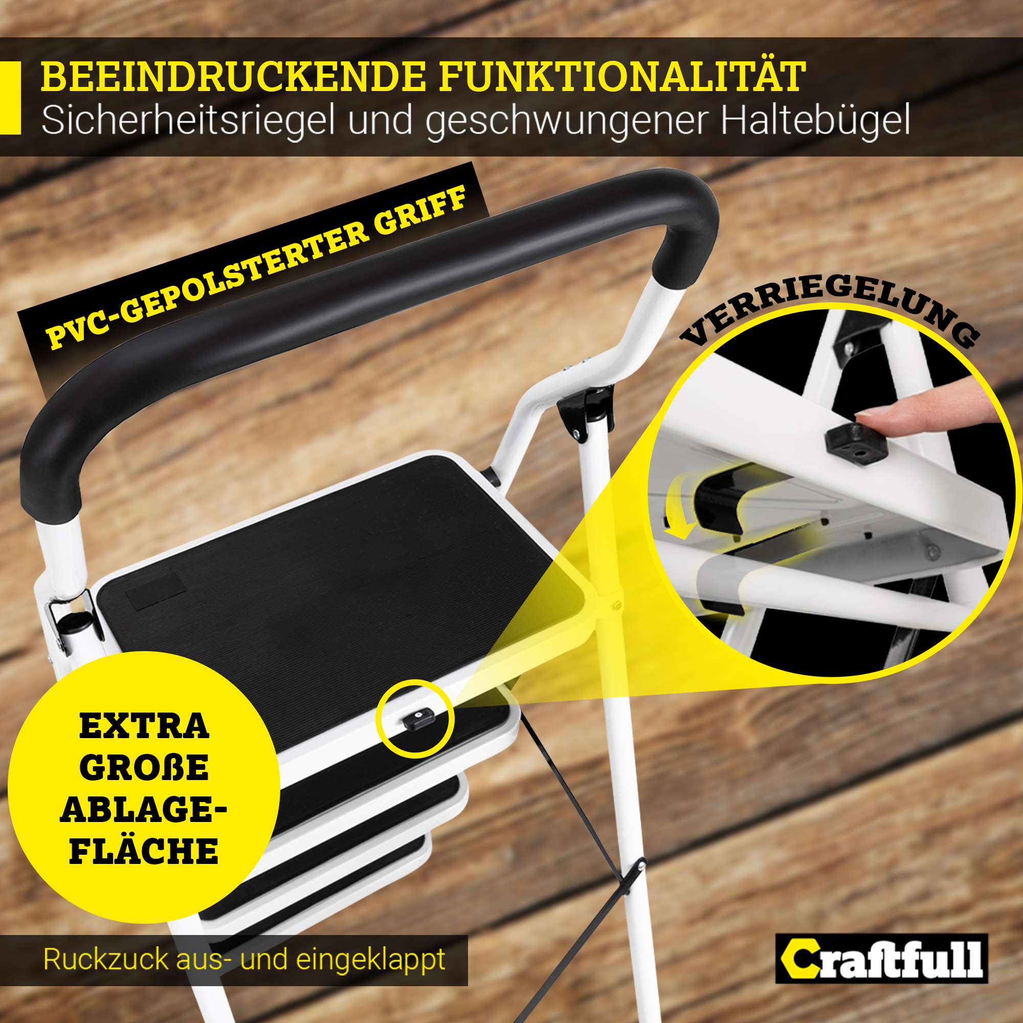 Ein hoher Küchenschrank, die Spitze des Weihnachtsbaums oder das verstaubte Regal – das alles ist jetzt kein Hindernis mehr. Denn der Craftfull Klapptritt CF-132A bringt Sie hoch hinaus! Dank der Trittleiter mit zwei, drei, vier oder fünf Stufen erledigen Sie auch Arbeiten in der Höhe besonders komfortabel. Die breiten Stufen schenken sicheren Halt. Die gummierten Standfüße und der Sicherheitsriegel sorgen für zusätzliche Stabilität. Zusammengeklappt ist die praktische Haushaltsleiter nicht nur kompakt verstaut, sondern auch kinderleicht zum nächsten Einsatzort transportiert. Ein besonderes Highlight dieses Klapptritts ist der nach innen geschwungene Haltebügel. Dadurch gewinnen Sie zusätzlichen Platz auf der obersten Plattform.