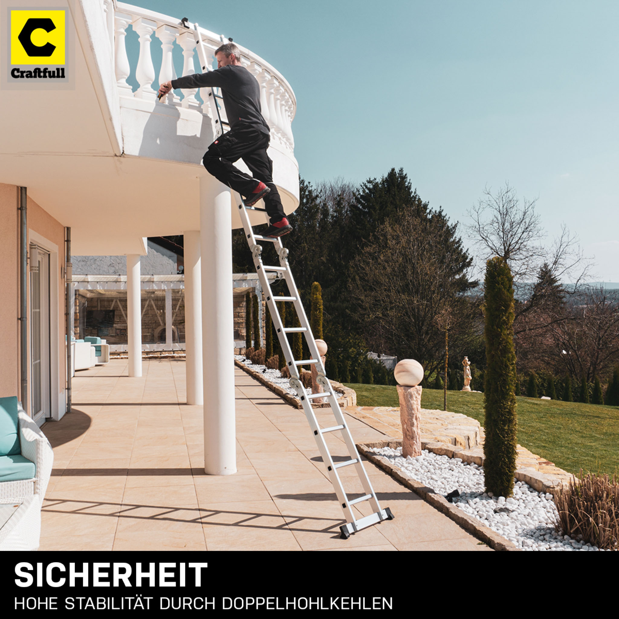 Mit Craftfull setzen Sie auf einen in Deutschland ansässigen Händler und somit berechenbare sowie serviceorientierte Qualität. Sie genießen mit dem Kauf der Craftfull Mehrzweckleiter CF-104A ein zuverlässiges Maß an Planbarkeit, wenn es um einen eventuellen Widerruf oder die Inanspruchnahme der Garantie über einen Zeitraum von 3 Jahren geht. Bei Problemen können Sie sich jederzeit an den freundlichen und lösungsorientierten Support wenden, um Ihr Anliegen zeitnah zu klären. Zudem setzen Sie mit deutscher Markenqualität auf Belastbarkeit und Sicherheit, was gerade bei einer Leiter für Arbeiten in der Höhe extrem wichtig ist.