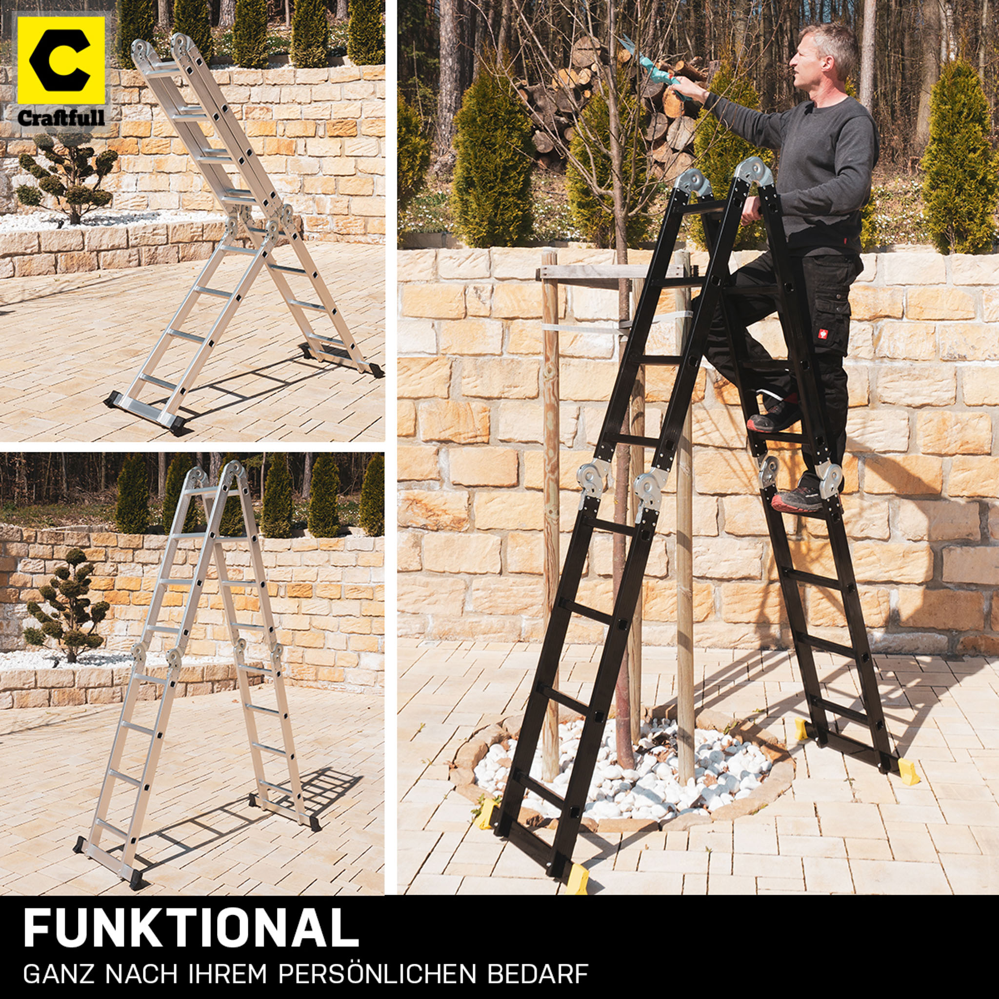 Sie wissen aus eigener Erfahrung, dass in Haus und Garten ständig neue Arbeiten anfallen. Gerade bei einem Umzug oder Renovierungsprojekten ist eine multifunktionale Leiter der Schlüssel für ein schnelles Vorankommen. Suchen Sie eine neue Leiter, die sich für möglichst viele Aufgaben flexibel verwenden lässt und zudem ein hohes Sicherheitsniveau aufweist? Dann treffen Sie mit der Craftfull Mehrzweckleiter CF-104A eine qualitätsbewusste Wahl. Arbeiten im Haushalt und Renovierungen stellen Sie immer wieder vor neue Herausforderungen: Mit dieser Multifunktionsleiter werden Sie jede Aufgabe flexibel bewältigen können, indem Sie mit wenigen Bewegungen einfach die erforderliche Funktion nutzbar machen! Insofern erwerben Sie mit diesem praktischen Multitalent gleich 6 Leiterarten in nur einer intelligenten Konstruktion. Sie müssen sich also nicht zwischen einer Multifunktionsleiter, einem Leitergerüst, einer Klappleiter, einer Allzweckleiter, einer Anlegeleiter und einer Arbeitsbühne entscheiden: Sie decken dank der 6in1-Multifunktionsleiter ein großes Anwendungsspektrum wirtschaftlich ab.