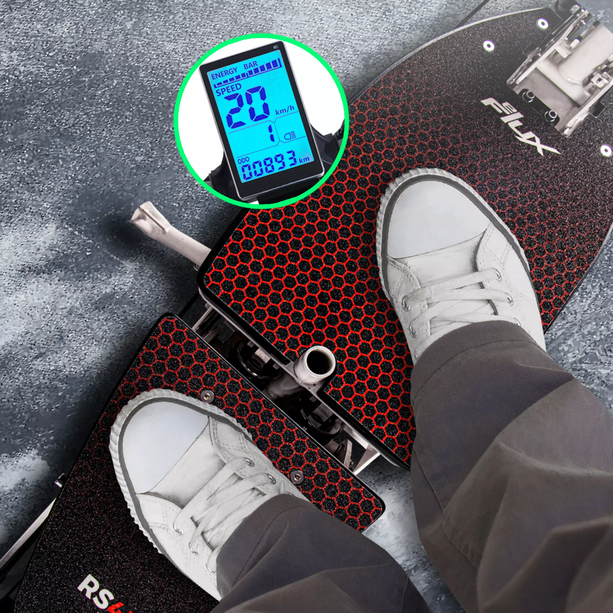 Im öffentlichen Straßenverkehr hat eine gute Sichtbarkeit höchste Priorität. Deshalb bringt der eFlux RS45 Pro E-Scooter starke & gleichzeitig sparsame LED-Scheinwerfer mit. Darüber hinaus ist er mit Reflektoren & einem Bremslicht ausgestattet.