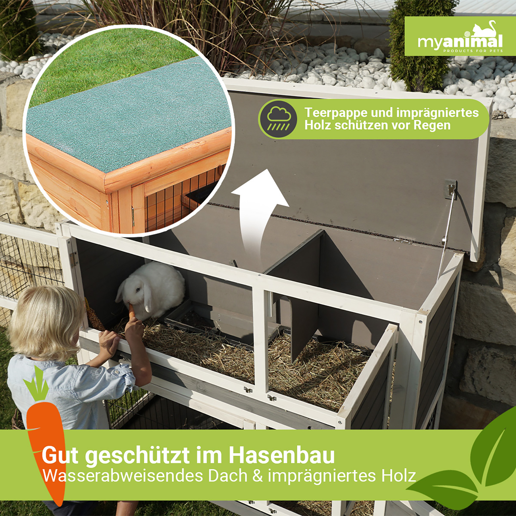 Im MyAnimal Hasenstall MH-20 findet der Hase seinen persönlichen Wohlfühlort! Auch für Sie wichtig: Der Kaninchenstall soll sich optisch schön in Ihren Garten einfügen. Deshalb gibt es den Kaninchenkäfig im schönen Holz-Design oder im natürlichen Landhaus-Look in den Farben Grau und Weiß.