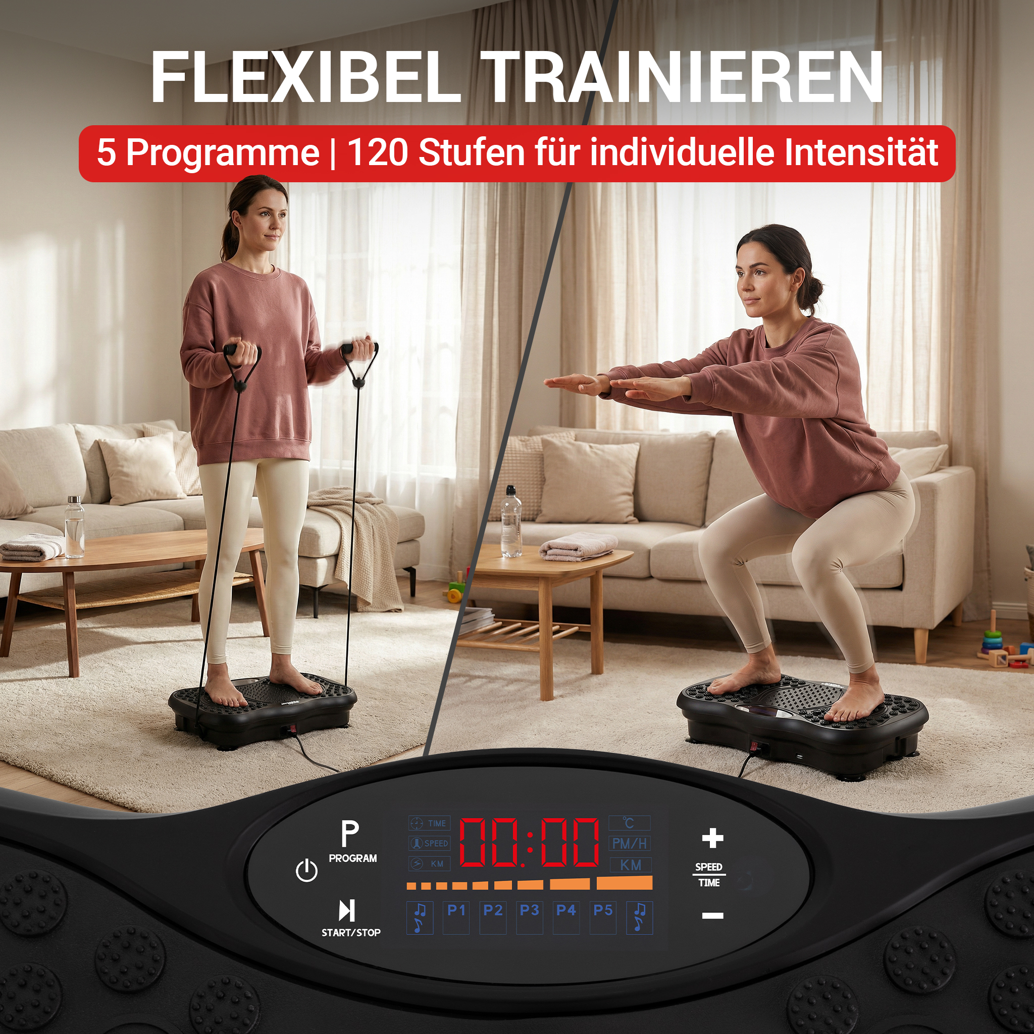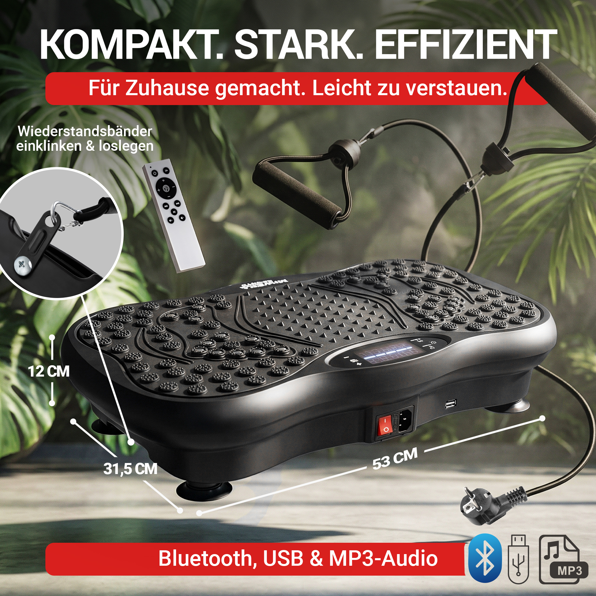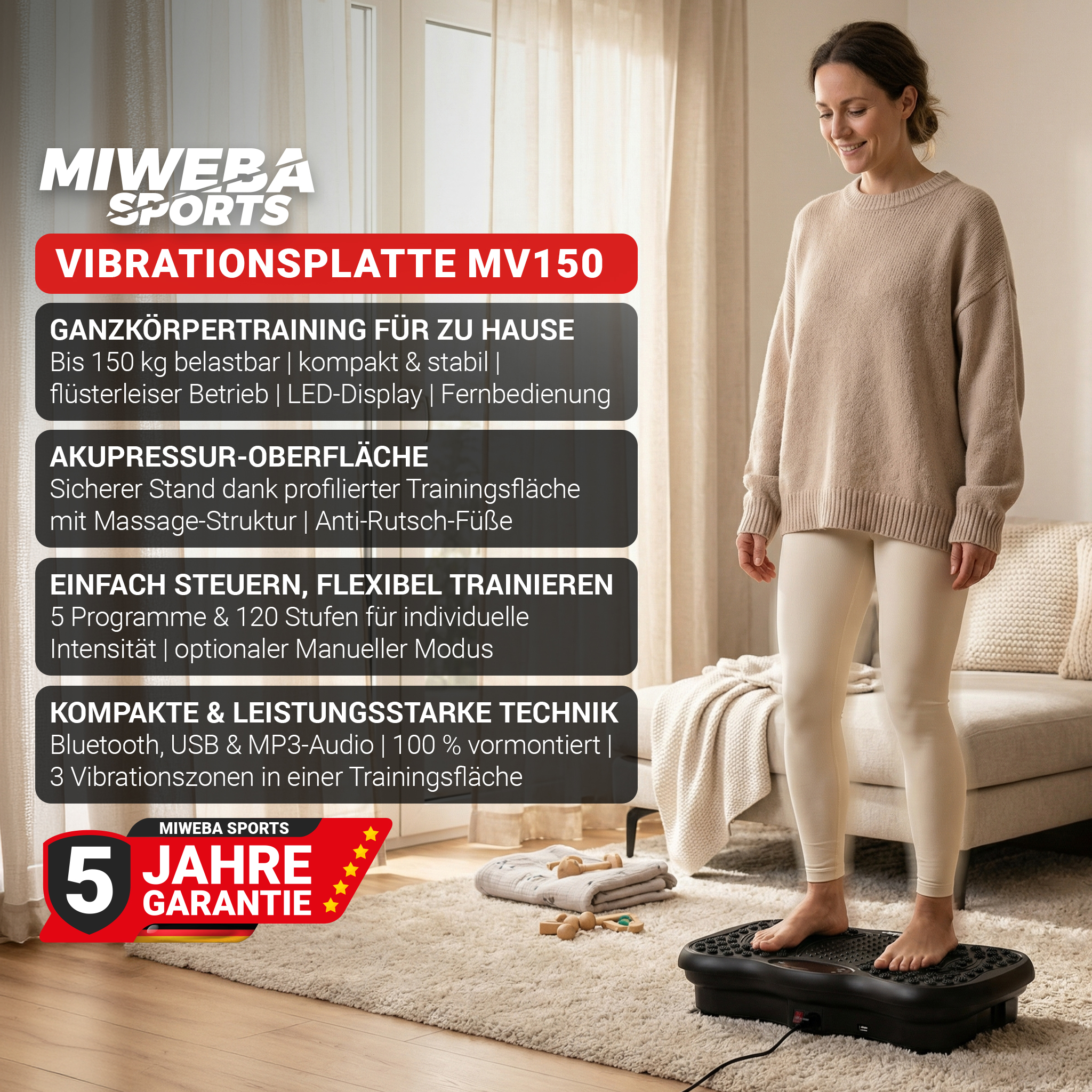 Produkthighlights 5 Jahre Garantie, Ganzkörpertraining für Zuhause & Büro, 120 Intensitätsstufen, 5 voreingestellte Programme & manueller Modus, Belastbar bis 150 kg, leiser Betrieb, kompakt & leicht, Akupressur-Standfläche mit 22 Magnetperlen, Bluetooth & Fernbedienung